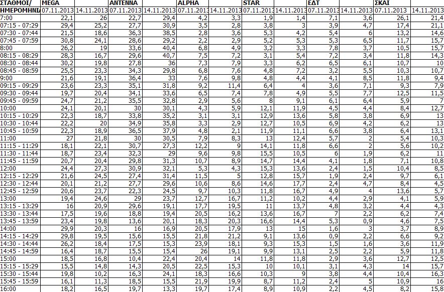 Δείτε τις χθεσινές (14/11) μετρήσεις τηλεθέασης των τηλεοπτικών σταθμών εθνικής εμβέλειας.