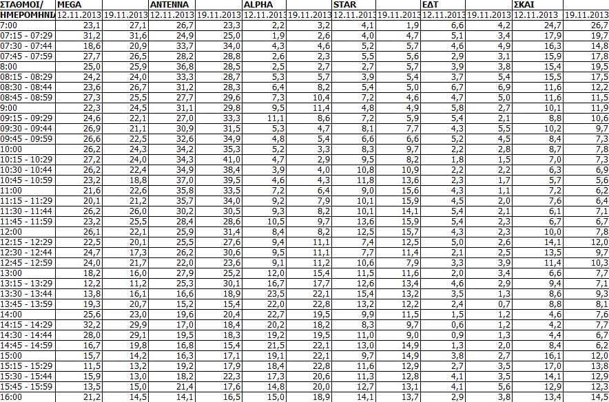 Δείτε τις χθεσινές (19/11) μετρήσεις τηλεθέασης των τηλεοπτικών σταθμών εθνικής εμβέλειας.