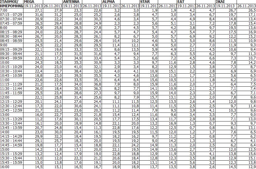 Δείτε τις χθεσινές (26/11) μετρήσεις τηλεθέασης των τηλεοπτικών σταθμών εθνικής εμβέλειας.