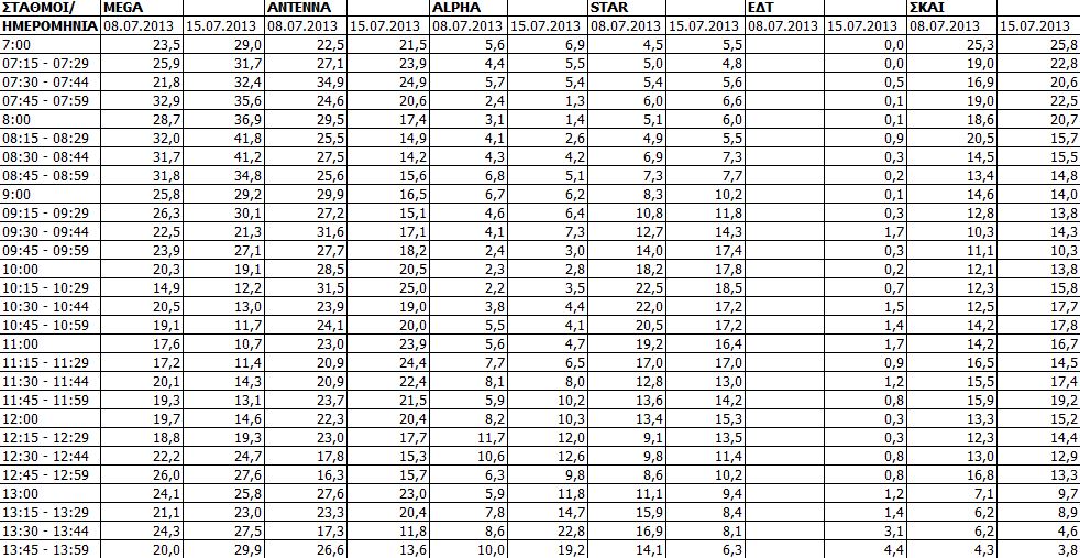 Δείτε τις χθεσινές (15/7) μετρήσεις τηλεθέασης των τηλεοπτικών σταθμών εθνικής εμβέλειας