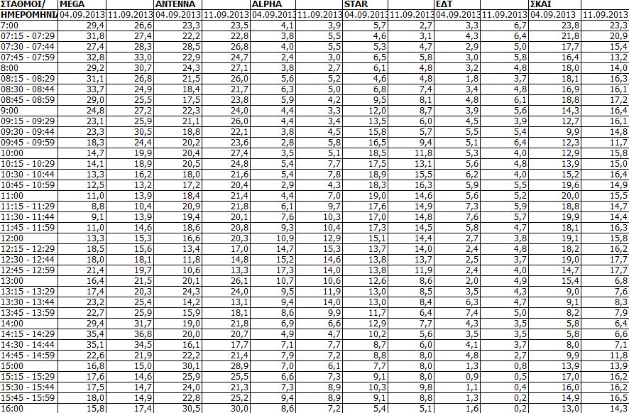 Δείτε τις χθεσινές (11/9) μετρήσεις τηλεθέασης των τηλεοπτικών σταθμών εθνικής εμβέλειας.