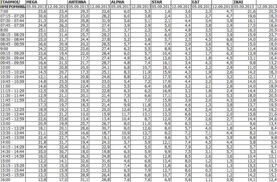Δείτε τις χθεσινές (12/9) μετρήσεις τηλεθέασης των τηλεοπτικών σταθμών εθνικής εμβέλειας.