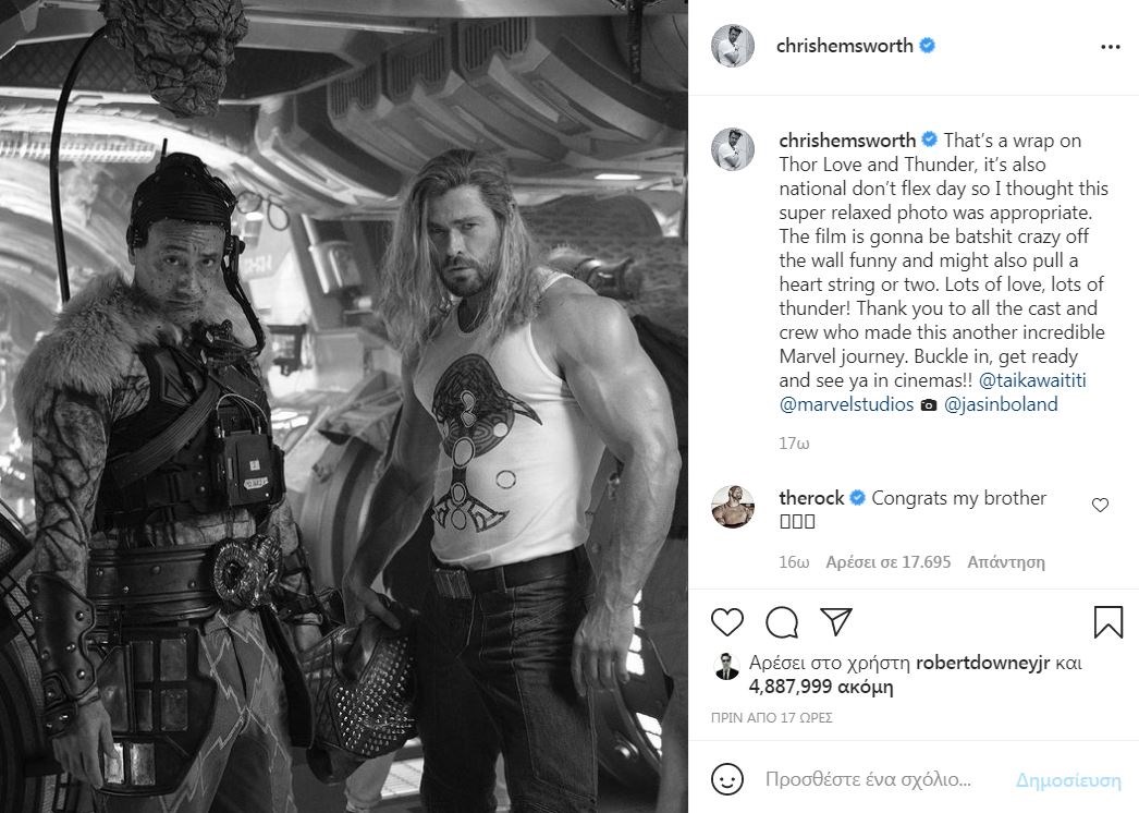Στη φωτογραφία ο Thor φαίνεται πιο “τούμπανο” από ποτέ.”Η ταινία θα είναι θεότρελη, παλαβή, θα κλάψετε από τα γέλια…και μπορεί και από τη συγκίνηση. Πολλή αγάπη και πολλούς κεραυνούς. Ευχαριστώ το cast και το συνεργείο που τα κατάφεραν για ένα ακόμη ταξίδι στη Marvel. Προσδεθείτε και ετοιμαστείτε να μας δείτε στις αίθουσες” έγραψε ο Κρις Χέμσγουορθ.