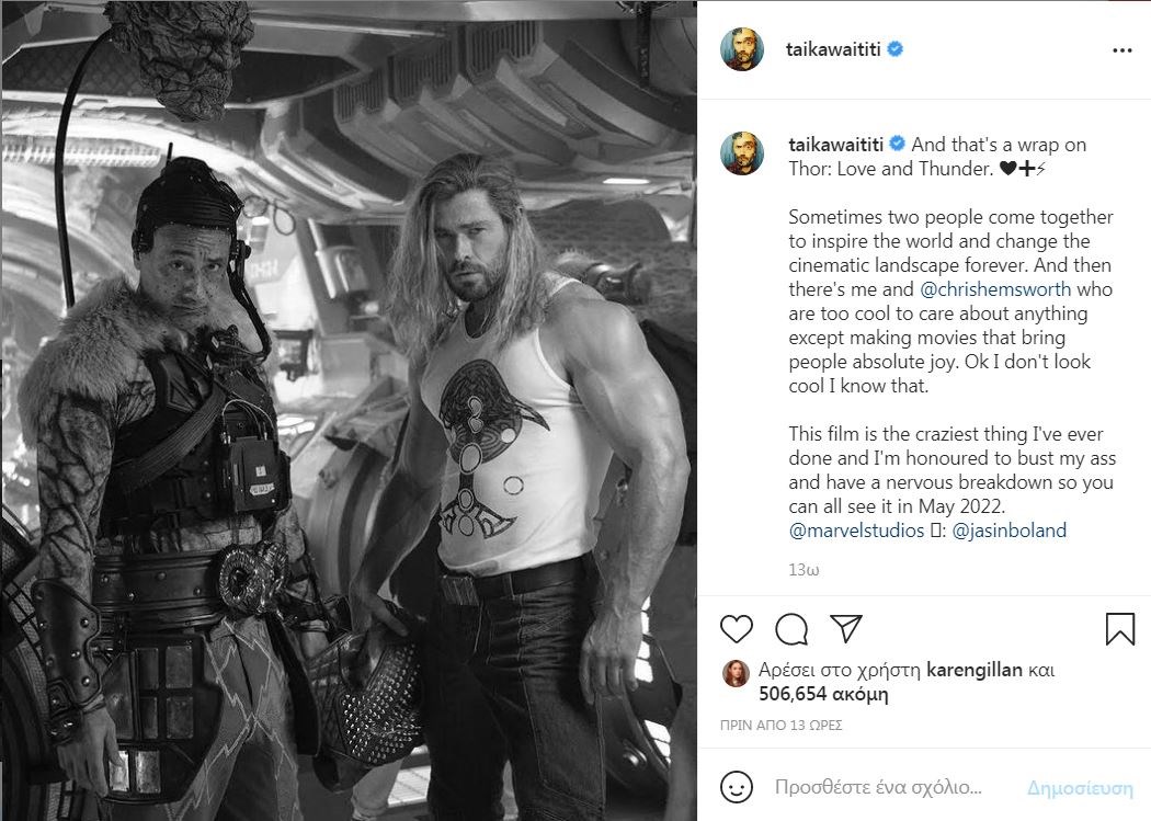 Την ίδια φωτογραφία ανέβασε και ο σκηνοθέτης της ταινίας, Τάικα Γουαϊτίτι, γράφοντας; “Είναι η πιο τρελή ταινία που έκανα και είναι τιμή μου που μου βγήκε ο κ@@@ς για να γίνει και πως μου προκάλεσε νευρικούς κλονισμούς, οπότε ανυπομονώ όλοι να τη δείτε τον Μαΐο του 2022.”