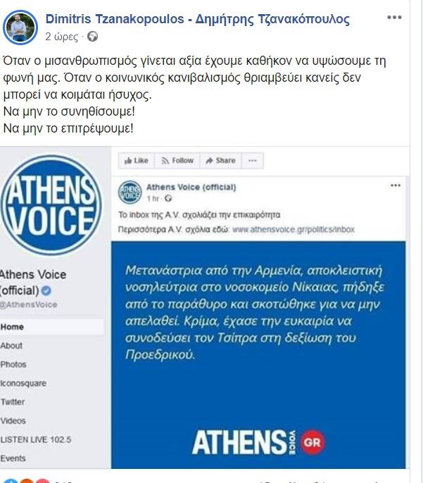 Πριν λίγες μέρες είχα δεχτεί την πρόταση να παραχωρήσω μια συνέντευξη στην Athens Voice παρότι ο λόγος της συχνά είναι εξαιρετικά κατεδαφιστικός έναντι της κυβέρνησης. Προφανώς μετά τα σημερινά, ακύρωσα την συνέντευξη. Είναι το ελάχιστο που μπορώ να κάνω. Γιατί εδώ δεν πρόκειται για πολιτική διαφωνία. Εδώ πρόκειται για απανθρωπιά”.