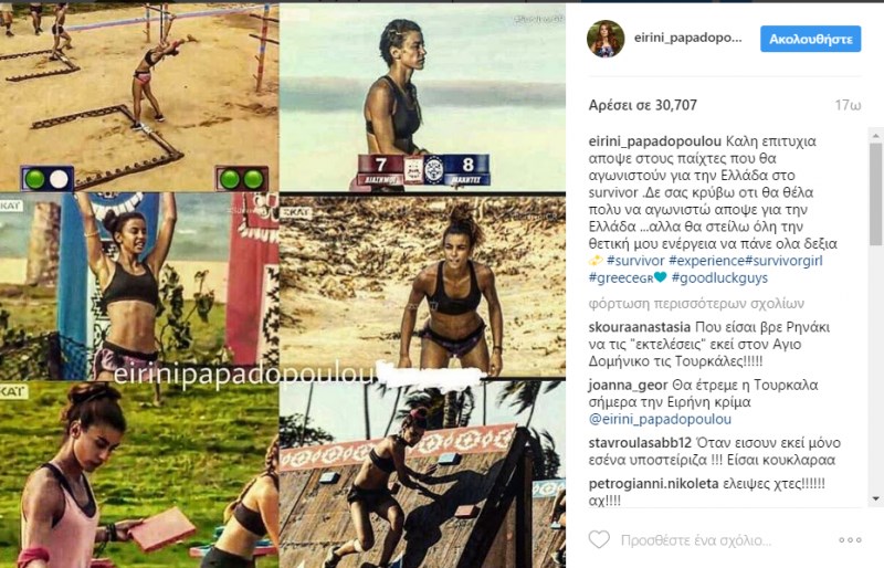 «Καλή επιτυχία απόψε στους παίχτες που θα αγωνιστούν για την Ελλάδα στο Survivor. Δε σας κρύβω ότι θα ήθελα πολύ να αγωνιστώ απόψε για την Ελλάδα…αλλά θα στείλω όλη την θετική μου ενέργεια να πάνε όλα δεξιά», έγραψε, ποστάροντας ένα κολάζ φωτογραφιών από την παρουσία της στο παιχνίδι.Δείτε την ανάρτηση της Ειρήνης Παπαδόπουλου:
