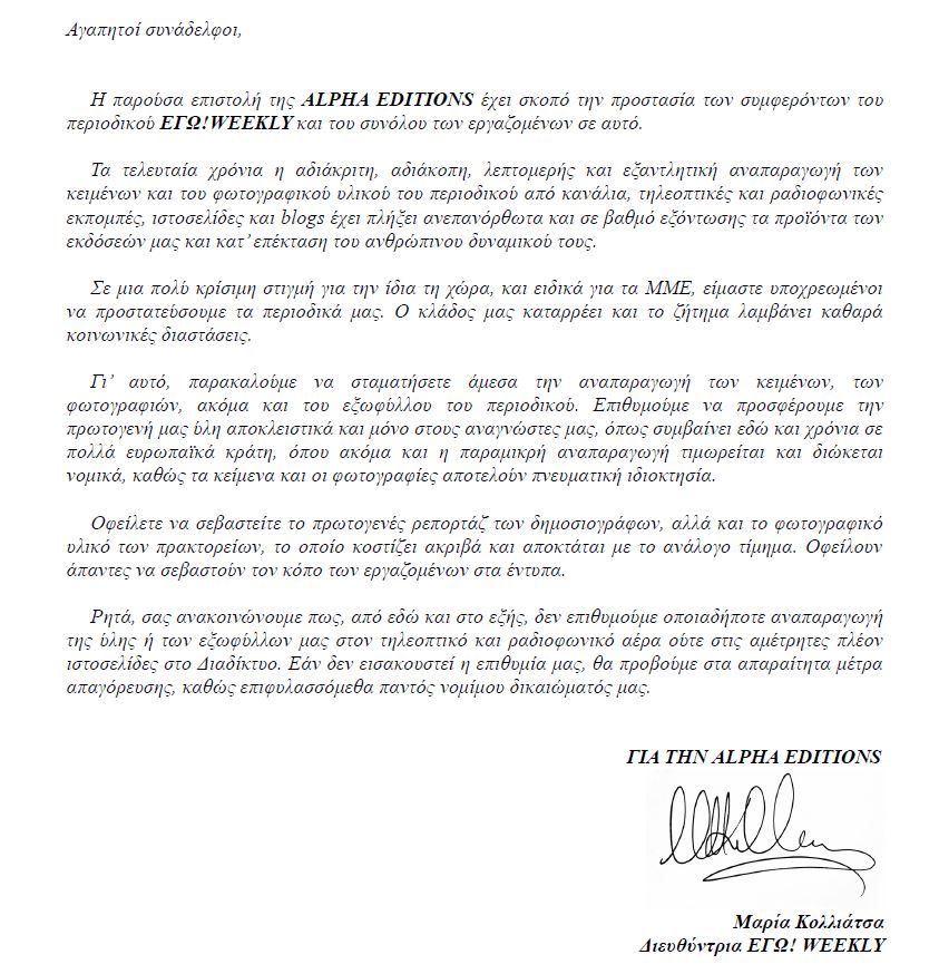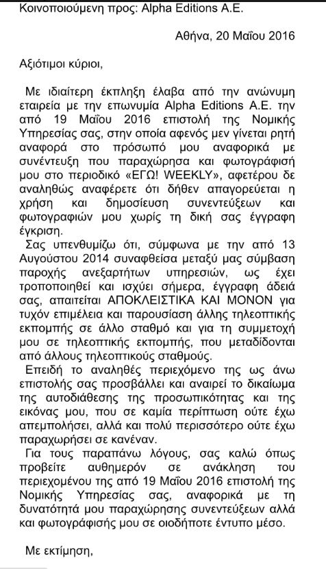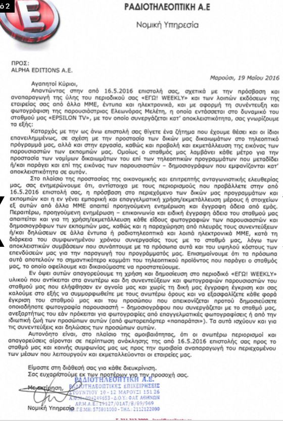 Σημειώνουμε ότι το “Ε” έστειλε επιστολή απαγόρευσης δημοσίευσης συνέντευξης της παρουσιάστριας στο περιοδικό, με αφορμή την επιστολή που είχε στείλει νωρίτερα το «Εγώ! Weekly» σε όλα τα ΜΜΕ για να σταματήσει η αναπαραγωγή των κειμένων, των φωτογραφιών και της ύλης του.