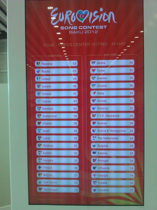 Ο χρόνος πριν την έναρξη του 57ου διαγωνισμού της Eurovision μετράει αντίστροφα – μόλις 11 μέρες μας χωρίζουν από την βραδιά του τελικού, που θα γίνει στο Μπακού, στο Αζερμπαιτζάν.Οι πρόβες έχουν ήδη γίνει και όπως κάθε χρόνο, οι διαπιστευμένοι δημοσιογράφοι, έκαναν την καθιερωμένη ψηφοφορία στο Κέντρο Τύπου, με την επιμέλεια του OGAE INTERNATIONAL.Σύμφωνα με τα αποτελέσματα, η Ελλάδα με το τραγούδι Aphrodisiac και την Ελευθερία Ελευθερίου βρίσκεται στην 5η θέση, ενώ η Κύπρος με την Ήβη Αδάμου στην 6η.