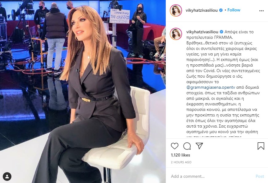 “Απόψε είναι το προτελευταίο ΓΡΆΜΜΑ. Βρέθηκε…θετικό στον ιό (ευτυχώς όλοι οι συντελεστές χαιρουμε άκρας υγείας, για να μη γίνει καμία παρανόηση!…). Η εκπομπή όμως (και η προσπάθειά μας)…νόσησε βαριά από τον Covid. Οι νέες συντεταγμένες ζωής που δημιούργησε ο ιός, αφαιμάσσουν το @grammagiasena.opentv από δομικά στοιχεία, όπως τα ταξίδια ανθρώπων από μακριά, οι αγκαλιές και η έκφραση συναισθημάτων, η παρουσία κοινού, με αποτέλεσμα να μην προκύπτει η ουσία της εκπομπής έτσι όπως όλοι την αγαπήσαμε όλα αυτά τα χρόνια. Σας ευχαριστώ αγαπημένο μου κοινό για την αγάπη και την εμπιστοσύνη, επίσης @nkoklonis και @opentvgr , αλλά κυρίως ένα μεγάλο ΕΥΧΑΡΙΣΤΏ στους συνεργάτες μου, την υπέροχη ομάδα του ΠΑΚΈΤΟΥ που σύσσωμη δούλεψε και για το ΓΡΆΜΜΑ! Αλλά καμιά φορά παιδιά έχεις να παλέψεις με δυνάμεις που σε ξεπερνούν. Η αγάπη ωστόσο και μεταξύ μας, αλλά και για κάθε έντιμη και άξια προσπάθεια, δεν ξεπερνιέται ποτέ! Κι αυτό είναι που κρατάμε. ❤ Μέχρι να επιστρέψει η ζωή στην κανονικότητά της, υπομονή!” έγραψε η παρουσιάστρια σε ανάρτησή της στο instagram.