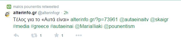 Πριν από λίγο ο Μάκης Πουνέντης έκανε retweet την είδηση για το τέλος της εκπομπής.