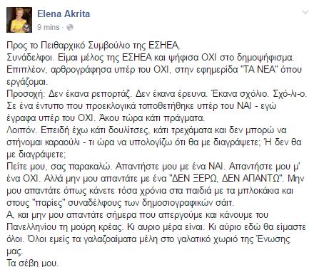 Η κ. Ακρίτα απευθυνόμενη προς το Πειθαρχικό Συμβούλιο επισημαίνει ότι την περίοδο του δημοψηφίσματος αρθρογράφησε υπέρ του ΟΧΙ και αναρωτιέται πότε το Συμβούλιο θα προχωρήσει στη διαγραφή της από την ΕΣΗΕΑ.
