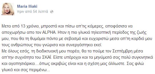 Ως την πιο γλυκιά τηλεοπτική περίοδος της ζωής της χαρακτήρισε τα 13 χρόνια της τηλεοπτικής της παρουσίας στον τηλεοπτικό σταθμό του Alpha, η Μαρία Ηλιάκη, μέσω του προσωπικού της λογαριασμού στο Facebook. Την ίδια στιγμή, η πρώην παρουσιάστρια του καναλιού της Κάντζας, ευχαρίστησε τους συνεργάτες της για την στήριξη που της πρόσφεραν όλα αυτά τα χρόνια και ανανέωσε το τηλεοπτικό της ραντεβού για τον Σεπτέμβριο, από την συχνότητα του ΣΚΑΪ.
