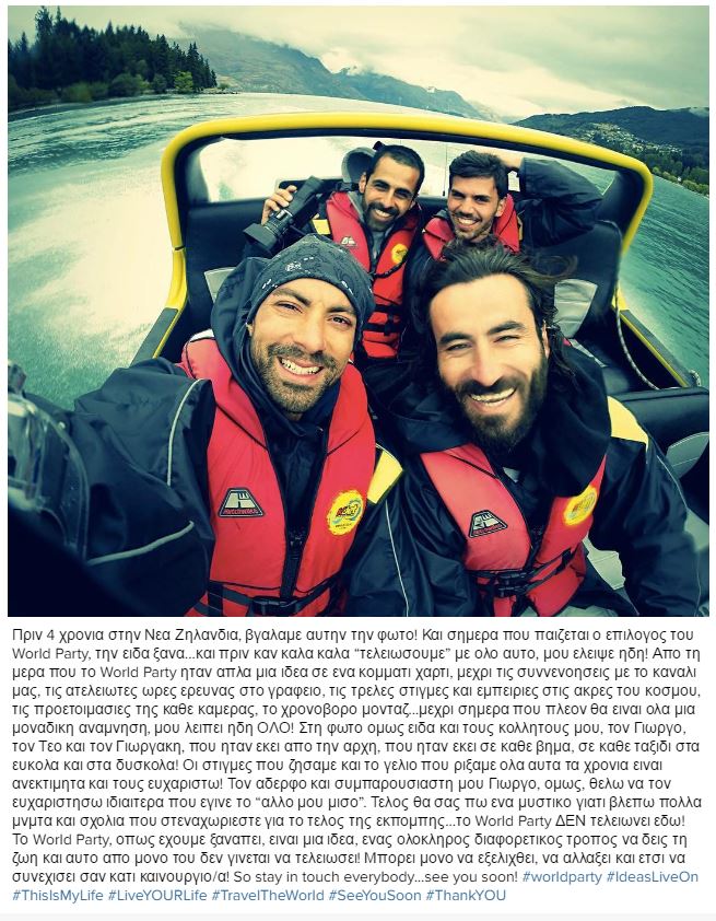 “Πριν από 4 χρόνια στην Νέα Ζηλανδία, βγάλαμε αυτήν την φωτό! Και σήμερα που παίζεται ο επίλογος του World Party, την είδα ξανά …και πριν καν καλά καλά “τελειώσουμε” με όλο αυτό, μου έλειψε ήδη! Από τη μέρα που το World Party ήταν απλά μια ιδέα σε ένα κομμάτι χαρτί, μέχρι τις συνεννοήσεις με το κανάλι μας, τις ατελείωτες ώρες έρευνας στο γραφείο, τις τρελές στιγμές και εμπειρίες στις άκρες του κόσμου, τις προετοιμασίες της κάθε κάμερας, το χρονοβόρο μοντάζ…μέχρι σήμερα που πλέον θα είναι όλα μια μοναδική ανάμνηση, μου λείπει ήδη ΟΛΟ!