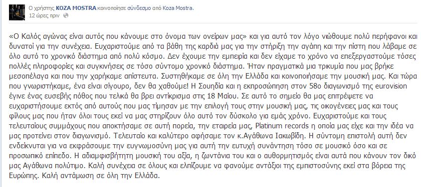 Οι νικητές του ελληνικού τελικού, οι Koza Mostra, που θα μας εκπροσωπήσουν στον διαγωνισμό της Eurovision, είπαν το δικό τους “ευχαριστω” μέσα από τη σελίδα τους στο Facebook…