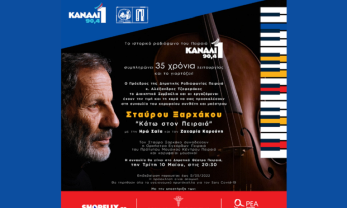 Το Δημοτικό Ραδιόφωνο Πειραιά, το ιστορικό «Κανάλι Ένα 90,4» συμπληρώνει 35 χρόνια λειτουργίας και το γιορτάζει με μια συναυλία του Σταύρου Ξαρχάκου στο Δημοτικό Θέατρο Πειραιά.