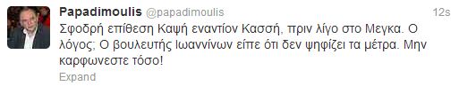 Πριν από λίγο, ο βουλευτής του ΣΥΡΙΖΑ σχολίασε στο trwitter, την αντίδραση του Μανώλη Καψή στο δελτίο του MEGA, για την είδηση από το επεισόδιο με τον βουλευτή Κασσή.