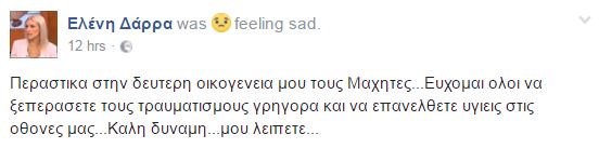 Η Ελένη Δάρρα, πρώην παίκτρια της ομάδας των «Μαχητών» του τηλεοπτικού ρεάλιτι Survivor, μέσω του λογαριασμού της στο facebook θέλησε να ευχηθεί περαστικά στους συμπαίκτες της μετά το τροχαίο ατύχημα που σημειώθηκε και είχε ως αποτέλεσμα τον τραυματισμό της Ειρήνης Κολιδά και του Μάριου Πρίαμου.«Περαστικά στην δεύτερη οικογένεια μου τους Μαχητές… Εύχομαι όλοι να ξεπεράσετε τους τραυματισμούς γρήγορα και να επανέλθετε υγιείς στις οθόνες μας… Καλή δύναμη… μου λείπετε…» έγραψε η πρώην συμπαίκτρια των Μαχητών.
