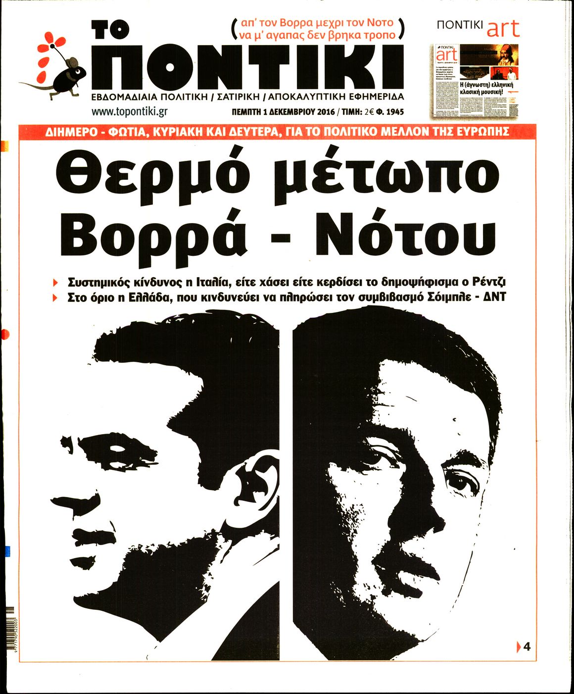 Το Ποντίκι σήμερα 1/12/2016 Enikos Newsroom 02:23, Πέμπτη 01 Δεκεμβρίου 2016 Media Διαβάστε το σημερινό πρωτοσέλιδο της εφημερίδας “Το Ποντίκι”: ΠΡΩΤΟΣΕΛΙΔΟ ΤΟ ΠΟΝΤΙΚΙ Μοιράσου το: σχολίασε κι εσύ (0 σχόλια) Ακολουθήστε το enikos.gr στο Google News και μάθετε πρώτοι όλες τις ειδήσεις Δείτε όλες τις τελευταίες ειδήσεις από την Ελλάδα και τον Κόσμο στο enikos.gr Ειδήσεις Ροή Ειδήσεων 1 ώρα πριν Αυτή είναι η λίστα με τα αιτήματα των αγροτών – Το «όχι» στη συνάντηση στο Μαξίμου και η έκκληση της κυβέρνησης για διάλογο με ανοιχτούς δρόμους 1 ώρα πριν Κρήτη: Θρίλερ με την εξαφάνιση του 33χρονου γιατρού – «Μου είπε “έλα πατέρα να μιλήσουμε γιατί δεν είμαι καλά”» 6 ώρες πριν ΟΠΕΚΕΠΕ – Παράνομες επιδοτήσεις: Τα 4 ΚΥΔ, οι 11 τραπεζικοί λογαριασμοί και οι ψευδείς αιτήσεις – Πεθαμένος «έκανε» αναλήψεις, 16 συλλήψεις 5 ώρες πριν Η «Άγρια Δύση» της δωρεάς σπέρματος: Τεράστια μπίζνα ύψους 2 δισ. δολαρίων – Τα «μωρά των Βίκινγκ» και η ανάγκη για όρια 3 ώρες πριν Μερτς: «Δεν ζούμε σε πόλεμο, αλλά, πλέον, ούτε και σε ειρήνη μόνο» – «Αν πέσει η Ουκρανία» στο στόχαστρο της Ρωσίας θα τεθεί η ΕΕ 4 ώρες πριν Το φινάλε του 2025 θα είναι μαγικό για 5 ζώδια – «Προαγωγές και νέες σχέσεις που θα διαρκέσουν μια ζωή» 8 ώρες πριν Ασθενής με νόσο του Crohn μοιράζεται τα 5 πράγματα που εύχεται να γνώριζε νωρίτερα για την πάθηση – «Τα συμπτώματα δεν περιορίζονται στο έντερο» 8 ώρες πριν Αυτές είναι οι 8 καθημερινές λέξεις που αποκαλύπτουν ότι είστε πιο έξυπνος από το 95% των ανθρώπων 10 ώρες πριν Ο σύντροφός της θέλει να γίνει «νοικοκυρά» στο σπίτι τους μετά τον γάμο – «Περιμένει από εμένα να καλύπτω όλα τα έξοδα» 11 λεπτά πριν Ελένη Χατζίδου για Τούνη – Αλεξάνδρου: «Σε αυτή την μάχη δεν υπάρχει νικητής» 18 λεπτά πριν ΗΠΑ: Οι πολίτες πιστεύουν ότι ο Τραμπ γνώριζε για τις παράνομες πράξεις του Επστάιν – Τι δείχνουν 2 δημοσκοπήσεις 27 λεπτά πριν Βουλή: Πυρά της αντιπολίτευσης με αιχμή τις αγροτικές κινητοποιήσεις – «Ο διάλογος που λέει η κυβέρνηση είναι προσχηματικός» – «Σταματήστε να ρίχνετε λάδι στη φωτιά» 34 λεπτά πριν Γιατί δεν είστε ευτυχισμένοι: Τα 7 σημάδια που μαρτυρούν ότι αναζητάτε την πηγή της χαράς σε λάθος μέρη 39 λεπτά πριν Πάτρα: Σοβαρό τροχαίο με έναν τραυματία – Συγκρούστηκαν δύο μοτοσικλέτες ENIKOS NETWORK «Με αυτόν τον τρόπο κατάφερα να απογειώσω τη σεξουαλική μου ζωή» – Τι αποκαλύπτει 40χρονη Πείτε «τέλος» στην ακμή χωρίς φάρμακα – Ειδικός αποκαλύπτει αποτελεσματική ρουτίνα περιποίησης Χριστούγεννα: Πόσο κοστίζει το φετινό τραπέζι για 4 άτομα – Αναλυτικά οι τιμές σε βασικά είδη Στάση εργασίας στα λεωφορεία την Τετάρτη – Ποια δρομολόγια θα εκτελούνται κανονικά Σύγχρονος Νοστράδαμος: Προειδοποιεί για «μεγάλο γεγονός» τους επόμενους μήνες που θα συγκλονίσει τη Βρετανία και τον κόσμο Τεστ παρατηρητικότητας: Μπορείτε να βρείτε τις 3 διαφορές στις εικόνες με έναν πιγκουίνο σε 14 δευτερόλεπτα περισσότερα 18:00 , Σάββατο 13 Δεκεμβρίου 2025 Η Realnews στο www.pressreader.com Διαβάστε την ψηφιακή έκδοση της εφημερίδας στην οθόνη του κινητού, του tablet και του υπολογισ... 15:46 , Σάββατο 13 Δεκεμβρίου 2025 Τηλεθέαση (12/12): Ποιες εκπομπές της πρωινής ζώνης πήραν προβάδισμα την Παρασκευή; Συνεχίστηκε η «μάχη» στην πρωινή ζώνη την Παρασκευή 12 Δεκεμβρίου, όπως φαίνεται και στους πίν... 13:50 , Σάββατο 13 Δεκεμβρίου 2025 Η Realnews αυτής της Κυριακής Με τίτλο: «”Ενέσεις” ρευστότητας στους αγρότες» κυκλοφορεί, αυτήν την Κυριακή, η R... 12:49 , Σάββατο 13 Δεκεμβρίου 2