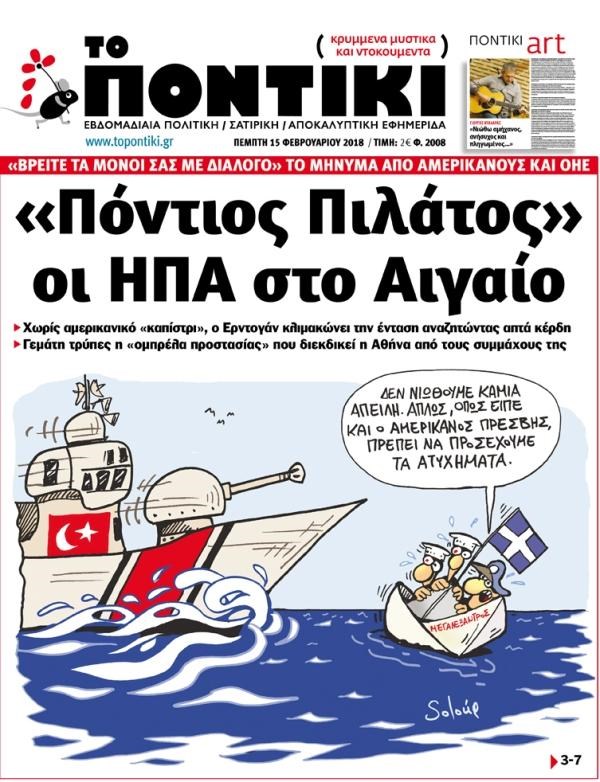 Με πρωτοσέλιδο τίτλο «“Πόντιος Πιλάτος” οι ΗΠΑ στο Αιγαίο» και αναλυτικά-αποκαλυπτικά ρεπορτάζ για τη νέα κλιμάκωση της έντασης στο Αιγαίο. • Οι ίσες αποστάσεις ΗΠΑ – ΟΗΕ και οι εγγενείς αδυναμίες της Ελλάδας επιβαρύνουν το ισοζύγιο ισχύος. Θα συνεχιστεί κλιμάκωση της τουρκικής επιθετικότητας. • Από την απεμπλοκή στα Ίμια το 1996 στην κλιμάκωση του τουρκικού τσαμπουκά του σήμερα. • Με όλους τσακώνεται κι απ’ όλους αγοράζει όπλα ο Ερντογάν. Συγκρουσιακή τακτική με ΝΑΤΟ, Ε.Ε. και διλήμματα στη Συμμαχία. Στο «Ποντίκι» που κυκλοφορεί το πρωί της Πέμπτης, μπορείτε επίσης να διαβάσετε: ΚΥΒΕΡΝΗΣΗ: 120 νύχτες… ακόλαστης διαπραγμάτευσης. Mέχρι τις 19 Ιουνίου, στο Eurogroup του Λουξεμβούργου, κρίνονται όλα για τη μεταμνημονιακή Ελλάδα. Όλοι οι κρίσιμοι σταθμοί μέχρι τη μεγάλη συμφωνία – πακέτο ΥΠΟΘΕΣΗ NOVARTIS: Πόλωση με ορίζοντα τις κάλπες. Στην Προανακριτική η αναζήτηση ποινικών ευθυνών – τον «πολιτικό ένοχο» «δείχνει» η κυβέρνηση ΝΔ: Προσωρινή κατάπαυση πυρός. Διαχρονική και με μέλλον η διάσταση μεταξύ μητσοτακικών και καραμανλικών ΚΟΣΜΟΣ: Τα σκοτεινά σημεία της παγκόσμιας αγοράς φαρμάκου. Οι αθέμιτες μέθοδοι του «κλειστού κλαμπ» των πολυεθνικών φαρμακοβιομηχανιών ΚΑΙ ΣΤΟ «ΠΟΝΤΙΚΙ ART» μεγάλη συνέντευξη του Γιώργου Νταλάρα.