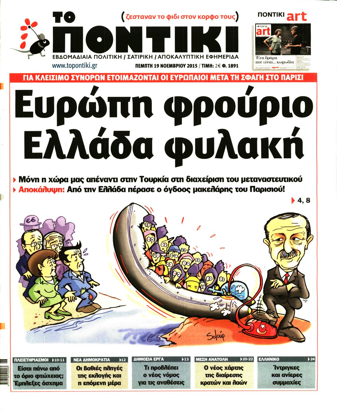 Το Ποντίκι σήμερα 19/11/2015 Enikos Newsroom 05:58, Πέμπτη 19 Νοεμβρίου 2015 Media Διαβάστε το σημερινό πρωτοσέλιδο της εφημερίδας ”Το Ποντίκι”… ΠΕΜΠΤΗ ΠΡΩΤΟΣΕΛΙΔΟ ΣΑΤΥΡΙΚΗ ΕΦΗΜΕΡΙΔΑ ΤΟ ΠΟΝΤΙΚΙ Μοιράσου το: σχολίασε κι εσύ (0 σχόλια) Ακολουθήστε το enikos.gr στο Google News και μάθετε πρώτοι όλες τις ειδήσεις Δείτε όλες τις τελευταίες ειδήσεις από την Ελλάδα και τον Κόσμο στο enikos.gr Ειδήσεις Ροή Ειδήσεων 3 ώρες πριν Αυτή είναι η λίστα με τα αιτήματα των αγροτών – Το «όχι» στη συνάντηση στο Μαξίμου και η έκκληση της κυβέρνησης για διάλογο με ανοιχτούς δρόμους 1 ώρα πριν Απάτες με επιδοτήσεις από τον ΟΠΕΚΕΠΕ στην Κρήτη: Ξεκίνησε η μεταγωγή των 16 συλληφθέντων στην Αθήνα – Τι λένε οι δικηγόροι τους 3 ώρες πριν Κρήτη: Θρίλερ με την εξαφάνιση του 33χρονου γιατρού – «Μου είπε “έλα πατέρα να μιλήσουμε γιατί δεν είμαι καλά”» 2 ώρες πριν Αργυρούπολη: Απείλησε με… τσεκούρι άλλον οδηγό ύστερα από καβγά – Στο αυτοκίνητό του βρέθηκε και αεροβόλο 2 ώρες πριν ΗΠΑ: Οι πολίτες πιστεύουν ότι ο Τραμπ γνώριζε για τις παράνομες πράξεις του Επστάιν – Τι δείχνουν 2 δημοσκοπήσεις 2 ώρες πριν Γιατί δεν είστε ευτυχισμένοι: Τα 7 σημάδια που μαρτυρούν ότι αναζητάτε την πηγή της χαράς σε λάθος μέρη 5 ώρες πριν Το φινάλε του 2025 θα είναι μαγικό για 5 ζώδια – «Προαγωγές και νέες σχέσεις που θα διαρκέσουν μια ζωή» 9 ώρες πριν Ασθενής με νόσο του Crohn μοιράζεται τα 5 πράγματα που εύχεται να γνώριζε νωρίτερα για την πάθηση – «Τα συμπτώματα δεν περιορίζονται στο έντερο» 1 ώρα πριν Χριστουγεννιάτικο δέντρο: Το έξυπνο κόλπο με τα στολίδια για να φαίνεται πιο γεμάτο 6 λεπτά πριν Αριθμολογία: Οι άνθρωποι που έχουν γεννηθεί αυτές τις 4 ημερομηνίες, δεν αντέχουν να κάνουν μία κλασική δουλειά γραφείου 10 λεπτά πριν ΗΠΑ: Έψαχνε τον γιο του στο Ground Zero για έξι μήνες – 24 χρόνια αργότερα, η 11η Σεπτεμβρίου τον σκότωσε και αυτόν 17 λεπτά πριν Απάτη στο Ηράκλειο: Προσποιούνταν τον αντιδήμαρχο και ζητούσε χρήματα για παράβολα 26 λεπτά πριν Συμπλοκή μεταξύ αλλοδαπών στο Ηράκλειο – Αναφορές για έναν τραυματία 34 λεπτά πριν Κώστας Τουρνάς: «Ο πρώτος που άκουγε ένα τραγούδι που έγραφα ήταν η γυναίκα μου…» ENIKOS NETWORK «Με αυτόν τον τρόπο κατάφερα να απογειώσω τη σεξουαλική μου ζωή» – Τι αποκαλύπτει 40χρονη Πείτε «τέλος» στην ακμή χωρίς φάρμακα – Ειδικός αποκαλύπτει αποτελεσματική ρουτίνα περιποίησης Δώρο Χριστουγέννων: Ποιοι θα πάρουν περισσότερα χρήματα φέτος – Η προθεσμία καταβολής Επίδομα θέρμανσης: Σε 3 δόσεις οι πληρωμές – Αναλυτικά οι ημερομηνίες καταβολής του Σύγχρονος Νοστράδαμος: Προειδοποιεί για «μεγάλο γεγονός» τους επόμενους μήνες που θα συγκλονίσει τη Βρετανία και τον κόσμο Τεστ παρατηρητικότητας: Μπορείτε να βρείτε τις 3 διαφορές στις εικόνες με έναν πιγκουίνο σε 14 δευτερόλεπτα περισσότερα 18:00 , Σάββατο 13 Δεκεμβρίου 2025 Η Realnews στο www.pressreader.com Διαβάστε την ψηφιακή έκδοση της εφημερίδας στην οθόνη του κινητού, του tablet και του υπολογισ... 15:46 , Σάββατο 13 Δεκεμβρίου 2025 Τηλεθέαση (12/12): Ποιες εκπομπές της πρωινής ζώνης πήραν προβάδισμα την Παρασκευή; Συνεχίστηκε η «μάχη» στην πρωινή ζώνη την Παρασκευή 12 Δεκεμβρίου, όπως φαίνεται και στους πίν... 13:50 , Σάββατο 13 Δεκεμβρίου 2025 Η Realnews αυτής της Κυριακής Με τίτλο: «”Ενέσεις” ρευστότητας στους αγρότες» κυκλοφορεί, αυτήν την Κυριακή, η R... 12:49 , Σάββατο 13 Δεκεμβρίου 2025 Grand Hotel: Η Αλίκη συναντά τον Πέτρο- Όλα όσα θα δούμε στα τελευταία επεισόδια της χρονιάς Ραγδαίες οι εξελίξεις στα νέα