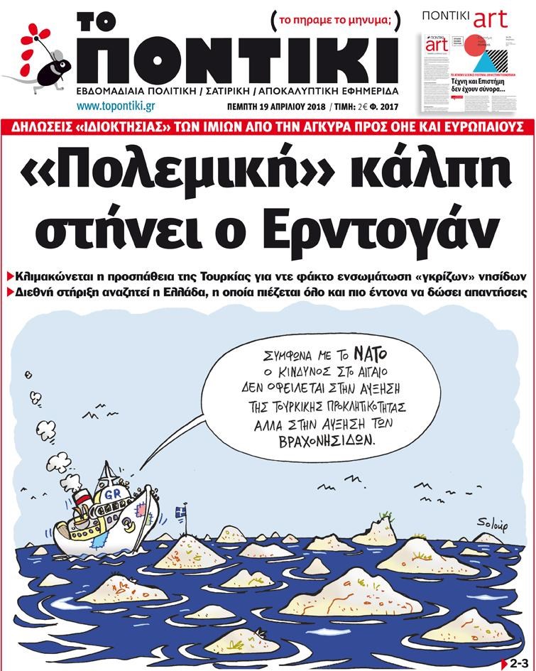 Με πρωτοσέλιδο τίτλο «”Πολεμική” κάλπη στήνει ο Ερντογάν» και αναλυτικό-αποκαλυπτικό ρεπορτάζ για τις δηλώσεις «ιδιοκτησίας» των Ιμίων από την Άγκυρα προς ΟΗΕ και Ευρωπαίους.
