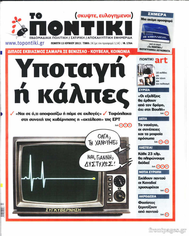 Το Ποντίκι σήμερα Enikos Newsroom 08:55, Πέμπτη 13 Ιουνίου 2013 Media Το Ποντίκι σήμερα Δείτε το σημερινό πρωτοσέλιδο της εφημερίδας Το Ποντίκι: ΠΡΩΤΟΣΕΛΙΔΟ ΤΟ ΠΟΝΤΙΚΙ Μοιράσου το: σχολίασε κι εσύ (0 σχόλια) Ακολουθήστε το enikos.gr στο Google News και μάθετε πρώτοι όλες τις ειδήσεις Δείτε όλες τις τελευταίες ειδήσεις από την Ελλάδα και τον Κόσμο στο enikos.gr Ειδήσεις Ροή Ειδήσεων 2 ώρες πριν ΟΠΕΚΕΠΕ – Κρήτη: Στην Ευρωπαϊκή Εισαγγελία οι 15 από τους 16 συλληφθέντες για τις παράνομες επιδοτήσεις 1 ώρα πριν Μακελειό στο Πανεπιστήμιο Μπράουν: Ένοπλος σκότωσε 2 άτομα και τραυμάτισε 9 – Το χρονικό των «ματωμένων» εξετάσεων και το βίντεο με τον ύποπτο δράστη 10 ώρες πριν Ανυποχώρητοι οι αγρότες: Δεν πάνε στο Μαξίμου, κλιμακώνουν τις κινητοποιήσεις – Ποια είναι τα αιτήματά τους 1 ώρα πριν Κυριακή με ανοιχτά καταστήματα σήμερα: Το ωράριο λειτουργίας – Τι ισχύει για τα σούπερ μάρκετ 2 ώρες πριν Εθνικό Μητρώο Παροχών και Ενισχύσεων: Ποιες αλλαγές έρχονται και πώς θα λειτουργεί 1 ώρα πριν Στο φως απομεινάρια μιας ξεχασμένης πόλης που «σημαδεύτηκε από συγκρούσεις» – Είναι θαμμένη κάτω από σύγχρονη μεγαλούπολη 3 ώρες πριν Οπτική ψευδαίσθηση: Μόνο αν έχετε παρατηρητικότητα ντετέκτιβ, θα βρείτε τον αριθμό «6» σε 5 δευτερόλεπτα 3 ώρες πριν Σπλαχνικό λίπος: Γιατρός του Χάρβαρντ αποκαλύπτει 7 τροφές που βοηθούν στη μείωσή του με φυσικό τρόπο 4 ώρες πριν Τα ζώδια σήμερα, Κυριακή 14 Δεκεμβρίου: Παρθένοι, αφιερώστε χρόνο για να καταλάβετε καλύτερα τα συναισθήματα 5 λεπτά πριν Μετρό: Προτεραιότητα η επέκταση προς Γλυφάδα λόγω της ανάπλασης του Ελληνικού – Το σχέδιο για τα Βόρεια Προάστια 12 λεπτά πριν Γιάννης Τσιμιτσέλης: Η φωτογραφία με ξανθά μαλλιά – «Να κρατήσω το χρώμα;» 12 λεπτά πριν ΑΠΕΥΘΕΙΑΣ – Η συζήτηση στη Βουλή για την ψήφιση του Κρατικού Προϋπολογισμού 2026 19 λεπτά πριν Ξέσπασε σε κλάματα με το χριστουγεννιάτικο δώρο του άνδρα της – «Μου είπε ότι είμαι το πιο αχάριστο άτομο που έχει γνωρίσει» 27 λεπτά πριν Ένοπλες Δυνάμεις: Σημαντικές οι αυξήσεις για όλα τα στελέχη με το νέο μισθολόγιο – Τι λένε πηγές του υπουργείου Εθνικής Άμυνας ENIKOS NETWORK Η Samantha του Sex & The City αποκαλύπτει την εμπειρία της με την εμμηνόπαυση: «Έμαθα καλύτερα τον εαυτό μου» Γιατί ξυπνάμε λίγα λεπτά πριν χτυπήσει το ξυπνητήρι; Οι επιστήμονες έδωσαν απάντηση Εθνικό Μητρώο Παροχών και Ενισχύσεων: Ποιες αλλαγές έρχονται και πώς θα λειτουργεί Νέα εποχή για την Εγνατία Οδό – Τι αλλάζει με επενδύσεις 1,8 δισ. ευρώ Σύγχρονος Νοστράδαμος: Προειδοποιεί για «μεγάλο γεγονός» τους επόμενους μήνες που θα συγκλονίσει τη Βρετανία και τον κόσμο Τεστ παρατηρητικότητας: Μπορείτε να βρείτε τις 3 διαφορές στις εικόνες με έναν πιγκουίνο σε 14 δευτερόλεπτα περισσότερα 08:46 , Κυριακή 14 Δεκεμβρίου 2025 Η Realnews στο www.pressreader.com Διαβάστε την ψηφιακή έκδοση της εφημερίδας στην οθόνη του κινητού, του tablet και του υπολογισ... 08:15 , Κυριακή 14 Δεκεμβρίου 2025 Σήμερα με τη Realnews: Food & Travel μαζί Beaute και Μαστορέματα Σήμερα με τη Realnews: Food & Travel μαζί Beaute και Μαστορέματα Food & Travel Ετοιμάζ... 07:46 , Κυριακή 14 Δεκεμβρίου 2025 Σήμερα με τη Realnews: Σκάναρε & κέρδισε με το PaduApp Τo κορυφαίο app επιβράβευσης στην Ελλάδα που σε ανταμείβει για κάθε αγορά! Κέρδισε με 3 μόνο β... 06:05 , Κυριακή 14 Δεκεμβρίου 2025 Σήμερα με τη Realnews: Δωροεπιταγή 10€ Δωροεπιταγή αξίας 10€ για αγορές άνω των 60€ από τα πολυκαταστήματα Factory Outlet. H προσφορά... ΤΕΛΕΥΤΑΙΕΣ ΕΙΔΗΣΕΙΣ 5 λεπτά πριν Μετρό: Προτεραιότητα η επέκταση προς Γλυ
