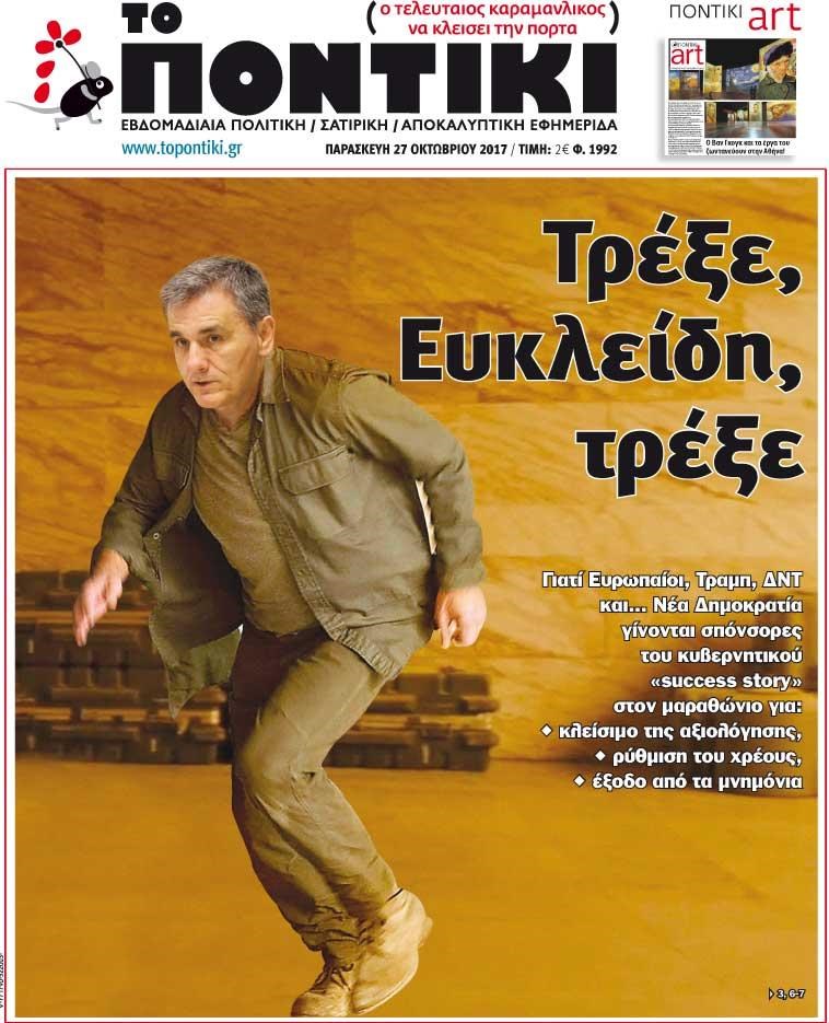 Με πρωτοσέλιδο τίτλο «Τρέξε, Ευκλείδη, τρέξε» και αναλυτικό-αποκαλυπτικό ρεπορτάζ για Ευρωπαίους, Τραμπ, ΔΝΤ και… Νέα Δημοκρατία που γίνονται σπόνσορες του κυβερνητικού «success story» στον μαραθώνιο για το κλείσιμο της αξιολόγησης, τη ρύθμιση του χρέους και την έξοδο από τα μνημόνια.