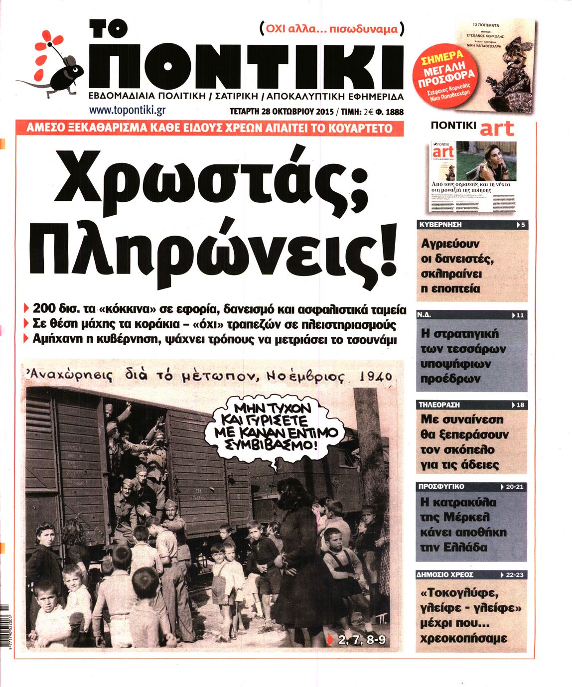 Το Ποντίκι σήμερα 28/10/2015 Enikos Newsroom 05:58, Τετάρτη 28 Οκτωβρίου 2015 Media Διαβάστε το σημερινό πρωτοσέλιδο της εφημερίδας ”Το Ποντίκι”… ΠΡΩΤΟΣΕΛΙΔΟ ΣΑΤΥΡΙΚΗ ΕΦΗΜΕΡΙΔΑ ΤΟ ΠΟΝΤΙΚΙ Μοιράσου το: σχολίασε κι εσύ (0 σχόλια) Ακολουθήστε το enikos.gr στο Google News και μάθετε πρώτοι όλες τις ειδήσεις Δείτε όλες τις τελευταίες ειδήσεις από την Ελλάδα και τον Κόσμο στο enikos.gr Ειδήσεις Ροή Ειδήσεων 3 ώρες πριν Αυτή είναι η λίστα με τα αιτήματα των αγροτών – Το «όχι» στη συνάντηση στο Μαξίμου και η έκκληση της κυβέρνησης για διάλογο με ανοιχτούς δρόμους 1 ώρα πριν Απάτες με επιδοτήσεις από τον ΟΠΕΚΕΠΕ στην Κρήτη: Ξεκίνησε η μεταγωγή των 16 συλληφθέντων στην Αθήνα – Τι λένε οι δικηγόροι τους 3 ώρες πριν Κρήτη: Θρίλερ με την εξαφάνιση του 33χρονου γιατρού – «Μου είπε “έλα πατέρα να μιλήσουμε γιατί δεν είμαι καλά”» 2 ώρες πριν Αργυρούπολη: Απείλησε με… τσεκούρι άλλον οδηγό ύστερα από καβγά – Στο αυτοκίνητό του βρέθηκε και αεροβόλο 2 ώρες πριν ΗΠΑ: Οι πολίτες πιστεύουν ότι ο Τραμπ γνώριζε για τις παράνομες πράξεις του Επστάιν – Τι δείχνουν 2 δημοσκοπήσεις 2 ώρες πριν Γιατί δεν είστε ευτυχισμένοι: Τα 7 σημάδια που μαρτυρούν ότι αναζητάτε την πηγή της χαράς σε λάθος μέρη 5 ώρες πριν Το φινάλε του 2025 θα είναι μαγικό για 5 ζώδια – «Προαγωγές και νέες σχέσεις που θα διαρκέσουν μια ζωή» 9 ώρες πριν Ασθενής με νόσο του Crohn μοιράζεται τα 5 πράγματα που εύχεται να γνώριζε νωρίτερα για την πάθηση – «Τα συμπτώματα δεν περιορίζονται στο έντερο» 1 ώρα πριν Χριστουγεννιάτικο δέντρο: Το έξυπνο κόλπο με τα στολίδια για να φαίνεται πιο γεμάτο 5 λεπτά πριν Ισραήλ: Η στιγμή που εκτελεί με πύραυλο τον Ραάντ Σαάντ, Νο2 στην ηγεσία της Χαμάς – Πώς δικαιολογεί την νέα παραβίαση της εκεχειρίας 13 λεπτά πριν Κωνσταντοπούλου: Προσωπικά έχω σκίσει πολλά καλσόν – Έχω δώσει πολλές μάχες για τα δικαιώματα για να αφήσω να κακοποιούν την αλήθεια 21 λεπτά πριν Αριθμολογία: Οι άνθρωποι που έχουν γεννηθεί αυτές τις 4 ημερομηνίες, δεν αντέχουν να κάνουν μία κλασική δουλειά γραφείου 25 λεπτά πριν ΗΠΑ: Έψαχνε τον γιο του στο Ground Zero για έξι μήνες – 24 χρόνια αργότερα, η 11η Σεπτεμβρίου τον σκότωσε και αυτόν 32 λεπτά πριν Απάτη στο Ηράκλειο: Προσποιούνταν τον αντιδήμαρχο και ζητούσε χρήματα για παράβολα ENIKOS NETWORK «Με αυτόν τον τρόπο κατάφερα να απογειώσω τη σεξουαλική μου ζωή» – Τι αποκαλύπτει 40χρονη Πείτε «τέλος» στην ακμή χωρίς φάρμακα – Ειδικός αποκαλύπτει αποτελεσματική ρουτίνα περιποίησης Voucher 200 ευρώ: Ποιοι και πώς θα το λάβουν – Οι καταληκτικές ημερομηνίες για τις αιτήσεις και την εξαργύρωση Δώρο Χριστουγέννων: Ποιοι θα πάρουν περισσότερα χρήματα φέτος – Η προθεσμία καταβολής Σύγχρονος Νοστράδαμος: Προειδοποιεί για «μεγάλο γεγονός» τους επόμενους μήνες που θα συγκλονίσει τη Βρετανία και τον κόσμο Τεστ παρατηρητικότητας: Μπορείτε να βρείτε τις 3 διαφορές στις εικόνες με έναν πιγκουίνο σε 14 δευτερόλεπτα περισσότερα 18:00 , Σάββατο 13 Δεκεμβρίου 2025 Η Realnews στο www.pressreader.com Διαβάστε την ψηφιακή έκδοση της εφημερίδας στην οθόνη του κινητού, του tablet και του υπολογισ... 15:46 , Σάββατο 13 Δεκεμβρίου 2025 Τηλεθέαση (12/12): Ποιες εκπομπές της πρωινής ζώνης πήραν προβάδισμα την Παρασκευή; Συνεχίστηκε η «μάχη» στην πρωινή ζώνη την Παρασκευή 12 Δεκεμβρίου, όπως φαίνεται και στους πίν... 13:50 , Σάββατο 13 Δεκεμβρίου 2025 Η Realnews αυτής της Κυριακής Με τίτλο: «”Ενέσεις” ρευστότητας στους αγρότες» κυκλοφορεί, αυτήν την Κυριακή, η R... 12:49 , Σάββατο 13 