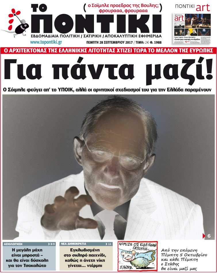 Με πρωτοσέλιδο τίτλο «Για πάντα μαζί!» και αναλυτικό-αποκαλυπτικό ρεπορτάζ για τον αρχιτέκτονα της ελληνικής λιτότητας, Βόλφγκαγκ Σόιμπλε, ο οποίος φεύγει από το γερμανικό υπουργείο Οικονομικών αλλά οι αρνητικοί του σχεδιασμοί για την Ελλάδα παραμένουν.