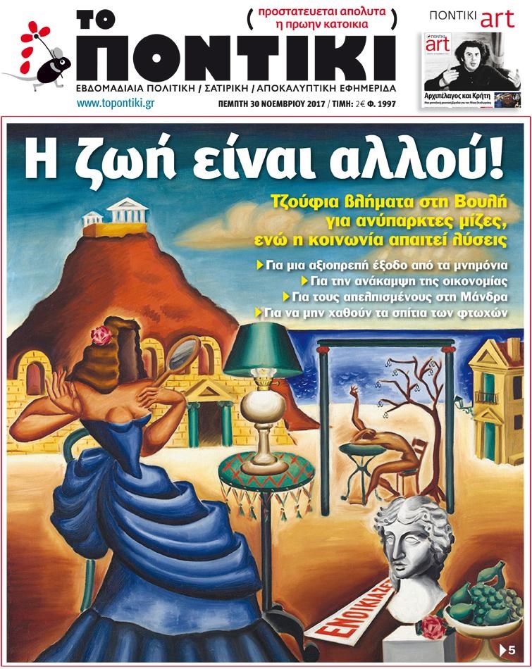 Με πρωτοσέλιδο τίτλο «Η ζωή είναι αλλού!» και αναλυτικό-αποκαλυπτικό ρεπορτάζ για τις πραγματικές ανησυχίες της ελληνικής κοινωνίας, οι οποίες σαφώς δεν αφορούν τους καβγάδες για τα ληγμένα βλήματα που επρόκειτο η Ελλάδα να πουλήσει στη Σαουδική Αραβία και οι οποίοι κυριαρχούν στην πολιτική επικαιρότητα.