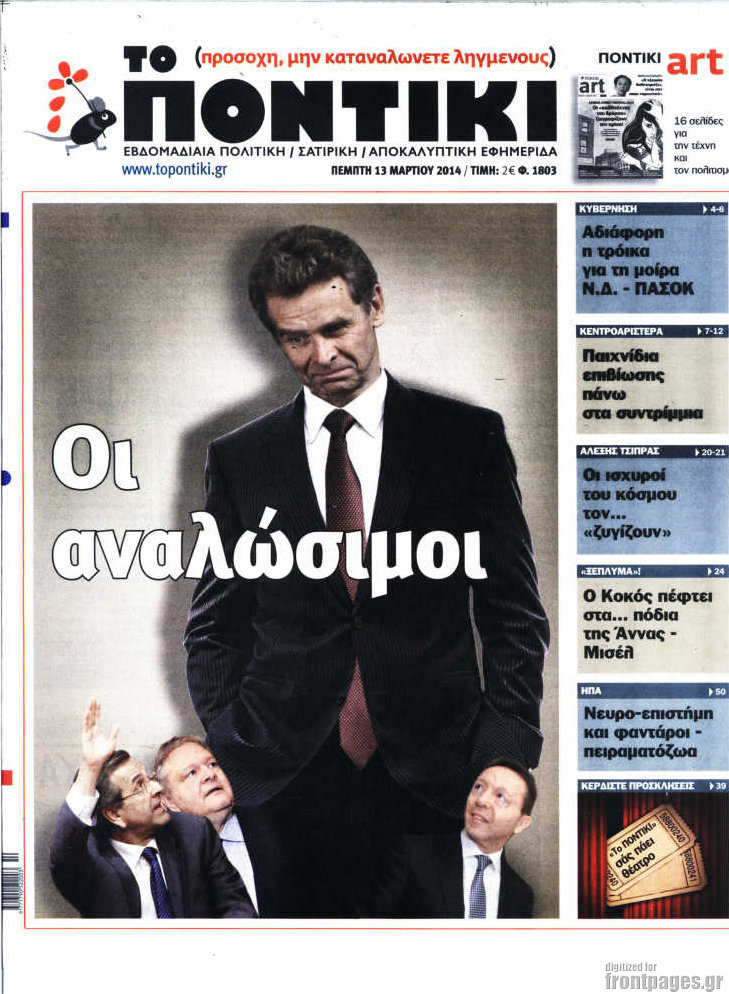 To Ποντίκι σήμερα Enikos Newsroom 08:44, Πέμπτη 13 Μαρτίου 2014 Media ΕΦΗΜΕΡΙΔΑ ΠΡΩΤΟΣΕΛΙΔΟ ΤΟ ΠΟΝΤΙΚΙ Μοιράσου το: σχολίασε κι εσύ (0 σχόλια) Ακολουθήστε το enikos.gr στο Google News και μάθετε πρώτοι όλες τις ειδήσεις Δείτε όλες τις τελευταίες ειδήσεις από την Ελλάδα και τον Κόσμο στο enikos.gr Ειδήσεις Ροή Ειδήσεων 5 λεπτά πριν Κυριάκος Μητσοτάκης μετά το «όχι» των αγροτών: Διάλογος δεν γίνεται με τελεσίγραφα και οι λύσεις προκύπτουν μόνο από συζήτηση 3 ώρες πριν ΟΠΕΚΕΠΕ – Κρήτη: Στην Ευρωπαϊκή Εισαγγελία οι 15 από τους 16 συλληφθέντες για τις παράνομες επιδοτήσεις 40 λεπτά πριν Πανεπιστήμιο Μπράουν: Βίντεο με αστυνομικούς να διασώζουν φοιτητές που είχαν κρυφτεί σε βιβλιοθήκη – Μαρτυρίες για σκηνές χάους και τρόμου 2 ώρες πριν Δώρο Χριστουγέννων 2025: Αντίστροφη μέτρηση για την καταβολή του – Ποιοι θα πάρουν περισσότερα φέτος και τι ισχύει για τη μερική απασχόληση 2 ώρες πριν Κυριακή με ανοιχτά καταστήματα σήμερα: Το ωράριο λειτουργίας – Τι ισχύει για τα σούπερ μάρκετ 1 ώρα πριν Ξέσπασε σε κλάματα με το χριστουγεννιάτικο δώρο του άνδρα της – «Μου είπε ότι είμαι το πιο αχάριστο άτομο που έχει γνωρίσει» 2 ώρες πριν Στο φως απομεινάρια μιας ξεχασμένης πόλης που «σημαδεύτηκε από συγκρούσεις» – Είναι θαμμένη κάτω από σύγχρονη μεγαλούπολη 4 ώρες πριν Σπλαχνικό λίπος: Γιατρός του Χάρβαρντ αποκαλύπτει 7 τροφές που βοηθούν στη μείωσή του με φυσικό τρόπο 5 ώρες πριν Τα ζώδια σήμερα, Κυριακή 14 Δεκεμβρίου: Παρθένοι, αφιερώστε χρόνο για να καταλάβετε καλύτερα τα συναισθήματα 4 λεπτά πριν Η γη της ελιάς: Η αρχή του τέλους του Δημοσθένη πλησιάζει 5 λεπτά πριν Κυριάκος Μητσοτάκης μετά το «όχι» των αγροτών: Διάλογος δεν γίνεται με τελεσίγραφα και οι λύσεις προκύπτουν μόνο από συζήτηση 10 λεπτά πριν Η ζωή γίνεται πολύ καλύτερη για 3 ζώδια – «Ίσως έχει έρθει η ώρα να κάνετε μια πραγματική και μόνιμη αλλαγή» 14 λεπτά πριν Τσιάρας για το «όχι» των αγροτών στη συνάντηση με Μητσοτάκη: «Αναλαμβάνουν τη δική τους ευθύνη για τη μη προσέλευση στον διάλογο» 22 λεπτά πριν NBA Cup: Σαν Αντόνιο και Νικς θα διεκδικήσουν το κύπελλο ENIKOS NETWORK Η «βρώμικη» αλήθεια για τον στεγνωτήρα χεριών: Πώς διασπείρει τα μικρόβια αντί να τα εξαλείφει, σύμφωνα με το Κλίβελαντ Η Samantha του Sex & The City αποκαλύπτει την εμπειρία της με την εμμηνόπαυση: «Έμαθα καλύτερα τον εαυτό μου» e- ΕΦΚΑ και ΔΥΠΑ: Ο «χάρτης» των πληρωμών έως και τις 19 Δεκεμβρίου Εθνικό Μητρώο Παροχών και Ενισχύσεων: Ποιες αλλαγές έρχονται και πώς θα λειτουργεί Σύγχρονος Νοστράδαμος: Προειδοποιεί για «μεγάλο γεγονός» τους επόμενους μήνες που θα συγκλονίσει τη Βρετανία και τον κόσμο Τεστ παρατηρητικότητας: Μπορείτε να βρείτε τις 3 διαφορές στις εικόνες με έναν πιγκουίνο σε 14 δευτερόλεπτα περισσότερα 10:07 , Κυριακή 14 Δεκεμβρίου 2025 Η γη της ελιάς: Η αρχή του τέλους του Δημοσθένη πλησιάζει Η δραματική σειρά του MEGA «Η γη της ελιάς» επιφυλάσσει ακόμα μεγαλύτερες ανατροπές. Κάθε επει... 08:46 , Κυριακή 14 Δεκεμβρίου 2025 Η Realnews στο www.pressreader.com Διαβάστε την ψηφιακή έκδοση της εφημερίδας στην οθόνη του κινητού, του tablet και του υπολογισ... 08:15 , Κυριακή 14 Δεκεμβρίου 2025 Σήμερα με τη Realnews: Food & Travel μαζί Beaute και Μαστορέματα Σήμερα με τη Realnews: Food & Travel μαζί Beaute και Μαστορέματα Food & Travel Ετοιμάζ... 07:46 , Κυριακή 14 Δεκεμβρίου 2025 Σήμερα με τη Realnews: Σκάναρε & κέρδισε με το PaduApp Τo κορυφαίο app επιβράβευσης στην Ελλάδα που σε ανταμείβει για κάθε αγορά! Κέρδισε με 3 μόνο β... ΤΕΛΕΥΤΑΙΕΣ ΕΙΔΗΣΕΙΣ 4 λεπτά πριν Η γ