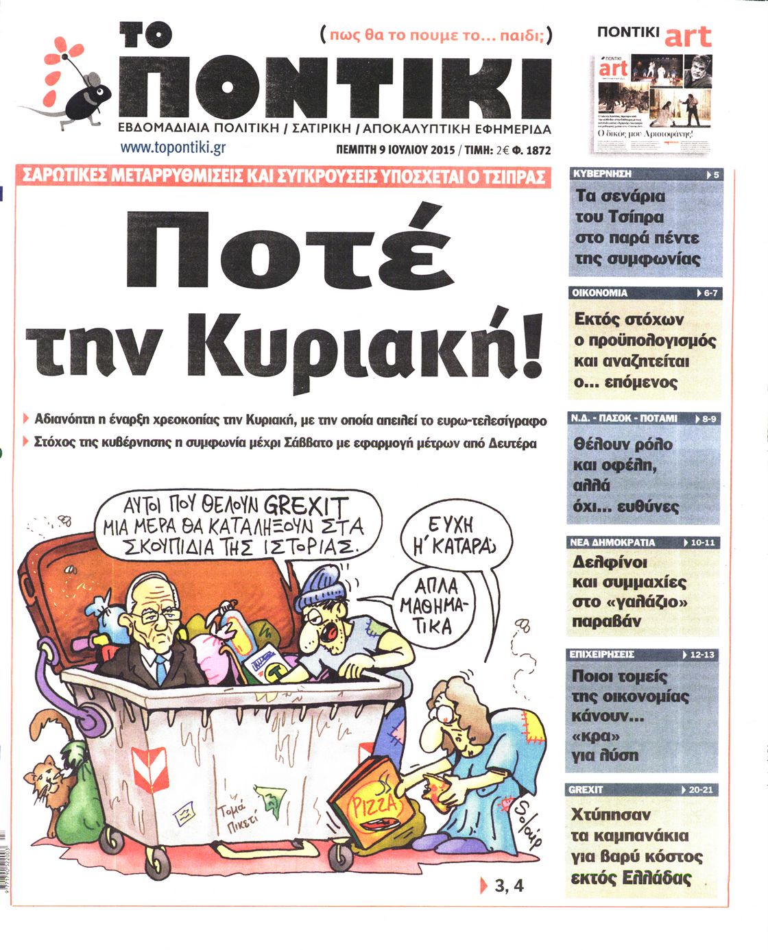 Το Ποντίκι σήμερα 9/7/2015 Enikos Newsroom 06:32, Πέμπτη 09 Ιουλίου 2015 Media Διαβάστε το σημερινό πρωτοσέλιδο της εφημερίδας ”Το Ποντίκι”… ΠΕΜΠΤΗ ΠΟΝΤΙΚΙ ΠΡΩΤΟΣΕΛΙΔΟ ΤΟ ΠΟΝΤΙΚΙ Μοιράσου το: σχολίασε κι εσύ (0 σχόλια) Ακολουθήστε το enikos.gr στο Google News και μάθετε πρώτοι όλες τις ειδήσεις Δείτε όλες τις τελευταίες ειδήσεις από την Ελλάδα και τον Κόσμο στο enikos.gr Ειδήσεις Ροή Ειδήσεων 21 λεπτά πριν Τραγωδία στη Ρουμανία: Πώς έγινε το πολύνεκρο τροχαίο με οπαδούς του ΠΑΟΚ 2 ώρες πριν «Το τέλος που είχαν όλες τους, είναι τραγικό»: Οι ιστορίες των 5 εργατριών που έχασαν την ζωή τους στο εργοστάσιο «Βιολάντα» 3 ώρες πριν ΗΠΑ: Περισσότεροι από 30 νεκροί λόγω της κακοκαιρίας με χιόνι έως 50 εκατοστά – Ανοιχτά καταφύγια στη Νέα Υόρκη, 548.000 σπίτια και επιχειρήσεις χωρίς ρεύμα 3 ώρες πριν Ολοκληρώθηκε η σύσκεψη στο Μαξίμου για την ευλογιά – Τσιάρας: «Θέμα εθνικής σημασίας να κρατήσουμε την ελληνική κτηνοτροφία ανθεκτική και βιώσιμη» 2 ώρες πριν ΗΠΑ: Συνελήφθη CEO φιλανθρωπικής οργάνωσης που καταχράστηκε 23 εκατ. δολάρια – Έκανε πολυτελή ζωή και αγόρασε εξοχικό στην Ελλάδα 4 ώρες πριν Οι άνθρωποι που βάζουν το χρήμα πάνω από τις σχέσεις, συνήθως έχουν αυτά 8 χαρακτηριστικά και δεν το συνειδητοποιούν 6 ώρες πριν Τα 3 ζώδια που εισέρχονται σε μια νέα εποχή αφθονίας – «Το σωστό timing και οι γνωριμίες σας βοηθούν να αλλάξετε πίστα» 7 ώρες πριν Οι γονείς του ήταν φτωχοί και δεν μπορούσαν να στηρίξουν τα 4 παιδιά τους – «Τα αδέλφια μου κατηγορούν εμένα για τις οικονομικές μας δυσκολίες» 5 ώρες πριν Απώλεια βάρους: Πώς ένας 31χρονος έχασε 95 κιλά χωρίς ενέσεις αδυνατίσματος – «Πρέπει να είσαι υγιής, όχι απλά αδύνατος» 5 λεπτά πριν ΣΥΡΙΖΑ: Ο Κυριάκος Μητσοτάκης φέρει ακέραια την ευθύνη για την εξόντωση της ελληνικής κτηνοτροφίας 13 λεπτά πριν Επιστήμονες ανακάλυψαν μια κρυφή κατάσταση μέσα σε υγρό μέταλλο – «Δεν θα έπρεπε να υπάρχει» 15 λεπτά πριν Mega Deal: Κινέζικος κολοσσός γίνεται ο βασικός μέτοχος της Puma – Deal 1,5 δισ. ευρώ 21 λεπτά πριν Τραγωδία στη Ρουμανία: Πώς έγινε το πολύνεκρο τροχαίο με οπαδούς του ΠΑΟΚ 29 λεπτά πριν Σύσκεψη υπό τον Μητσοτάκη για την κυκλοφοριακή ασφυξία στους δρόμους της Αττικής – Οι προτάσεις για την Αθήνα που εξετάζονται ENIKOS NETWORK Καρδιακή Ανεπάρκεια: Πανδημία της Τρίτης Ηλικίας με βαρύ κόστος για το ΕΣΥ Άδωνις Γεωργιάδης: Ταχύτερη έλευση καινοτόμων φαρμάκων, αύξηση 30% στις αμοιβές γιατρών ΕΟΠΥΥ και 5.000 προσλήψεις στο ΕΣΥ ΔΥΠΑ: Έρχονται περισσότερες από 1.000 θέσεις εργασίας ΑΣΕΠ: Έρχεται η πρώτη μεγάλη προκήρυξη για προσλήψεις στο Δημόσιο- Όλες οι λεπτομέρειες Σοκ: Πέθανε 24χρονος έπειτα από αποτυχημένη μεταμόσχευση γενιού στην Τουρκία – Την επέμβαση έκανε μεσίτης που προσποιείτο τ... Τεστ παρατηρητικότητας: Μπορείτε να βρείτε τις 3 διαφορές στις εικόνες με ένα κορίτσι σε 18 δευτερόλεπτα περισσότερα 13:37 , Τρίτη 27 Ιανουαρίου 2026 Ελένη Σπανοπούλου για Ιάσονα Τριανταφυλλίδη: Ενας χρόνος από τον θάνατό του Ανάρτηση για τη συμπλήρωση ενός έτους από τον θάνατο του Ιάσονα Τριανταφυλλίδη έκανε η δημοσιο... 12:25 , Τρίτη 27 Ιανουαρίου 2026 Ακούστε την εκπομπή του Νίκου Χατζηνικολάου 27/1/2026 Ακούστε την εκπομπή του Νίκου Χατζηνικολάου στον ραδιοφωνικό σταθμό RealFm 97,8, την Τρίτη 27 ... 12:10 , Τρίτη 27 Ιανουαρίου 2026 Βραβεία Tony 2026: Ανακοινώθηκε η ημερομηνία της 79ης τελετής Η τελετή απονομής των Βραβείων Tony 2026, ο κορυφαίος θεσμός αναγνώρισης του αμερικανικού θεάτ... 10:55 , Τρίτη 27 Ιανουαρίου 2026 Πρεμιέρ