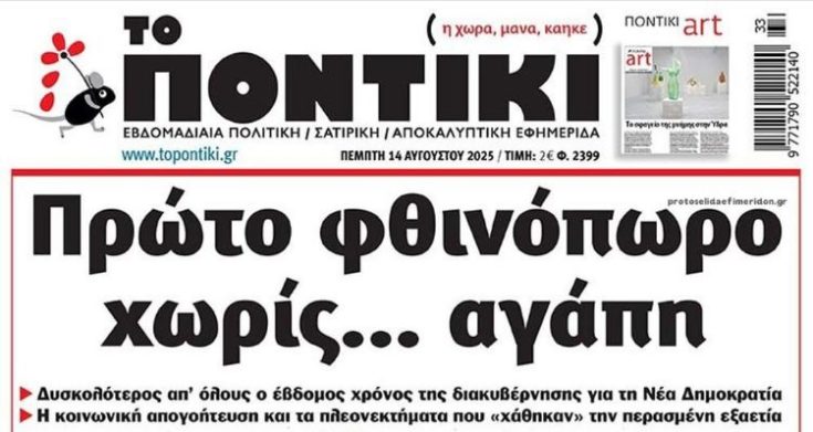 Το Ποντίκι σήμερα Πέμπτη 14/8/2025 6 μήνες ago Media ΕΦΗΜΕΡΙΔΑ ΤΟ ΠΟΝΤΙΚΙ ΠΡΩΤΟΣΕΛΙΔΟ ΤΟ ΠΟΝΤΙΚΙ ΤΟ ΠΟΝΤΙΚΙ Διαβάστε το πρωτοσέλιδο της εφημερίδας «Το Ποντίκι» σήμερα 14/8/2025.