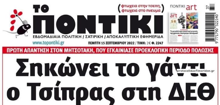 Το Ποντίκι σήμερα Πέμπτη 15/9/2022 3 έτη ago Media ΕΦΗΜΕΡΙΔΕΣ ΠΡΩΤΟΣΕΛΙΔΑ ΤΟ ΠΟΝΤΙΚΙ Διαβάστε το πρωτοσέλιδο της εφημερίδας «Το Ποντίκι» σήμερα 15/09/2022.
