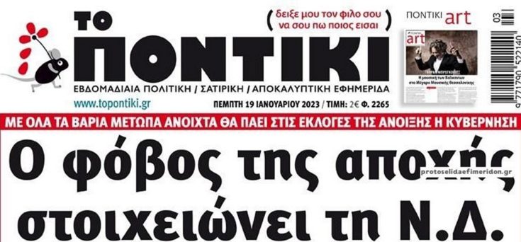 Το Ποντίκι σήμερα Πέμπτη 19/1/2023 3 έτη ago Media ΕΦΗΜΕΡΙΔΕΣ ΠΡΩΤΟΣΕΛΙΔΑ ΤΟ ΠΟΝΤΙΚΙ Διαβάστε το πρωτοσέλιδο της εφημερίδας «Το Ποντίκι» σήμερα 19/1/2023.