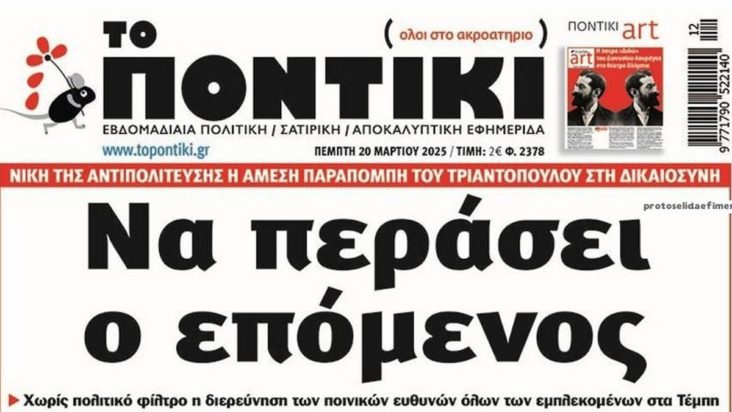 Το Ποντίκι σήμερα Πέμπτη 20/3/2025 9 μήνες ago Media ΕΦΗΜΕΡΙΔΕΣ ΠΡΩΤΟΣΕΛΙΔΑ ΤΟ ΠΟΝΤΙΚΙ Διαβάστε το πρωτοσέλιδο της εφημερίδας «Το Ποντίκι» σήμερα 20/3/2025.