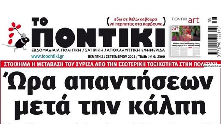 Το Ποντίκι σήμερα Πέμπτη 21/9/2023 2 έτη ago Media ΕΦΗΜΕΡΙΔΕΣ ΠΡΩΤΟΣΕΛΙΔΑ ΤΟ ΠΟΝΤΙΚΙ Διαβάστε το πρωτοσέλιδο της εφημερίδας «Το Ποντίκι» σήμερα 21/09/2023.