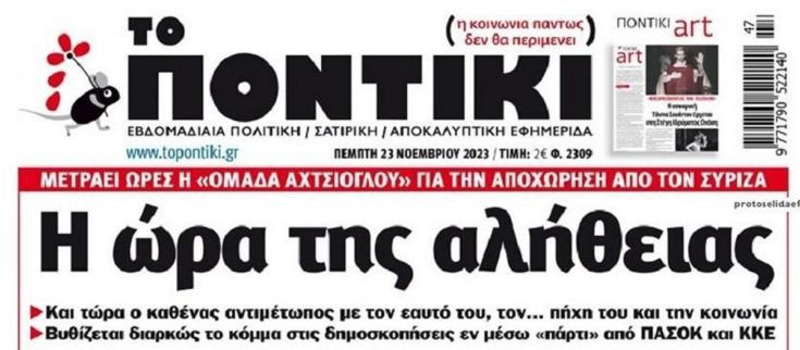 Το Ποντίκι σήμερα Πέμπτη 23/11/2023 2 έτη ago Media ΕΦΗΜΕΡΙΔΕΣ ΠΡΩΤΟΣΕΛΙΔΑ ΤΟ ΠΟΝΤΙΚΙ Διαβάστε το πρωτοσέλιδο της εφημερίδας «Το Ποντίκι» σήμερα 23/11/2023.