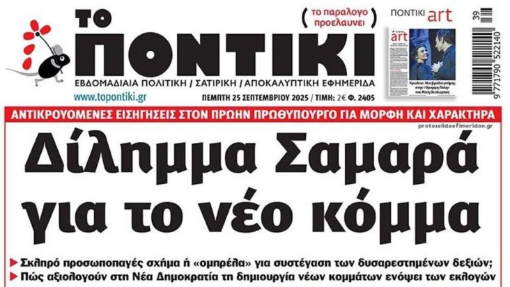 Το Ποντίκι σήμερα Πέμπτη 25/9/2025 3 μήνες ago Media ΕΦΗΜΕΡΙΔΕΣ ΠΡΩΤΟΣΕΛΙΔΑ ΤΟ ΠΟΝΤΙΚΙ Διαβάστε το πρωτοσέλιδο της εφημερίδας «Το Ποντίκι» σήμερα 25/9/2025.