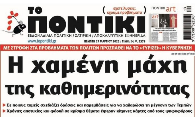 Το Ποντίκι σήμερα Πέμπτη 27/3/2025 9 μήνες ago Media ΕΦΗΜΕΡΙΔΕΣ ΠΡΩΤΟΣΕΛΙΔΑ ΤΟ ΠΟΝΤΙΚΙ Διαβάστε το πρωτοσέλιδο της εφημερίδας «Το Ποντίκι» σήμερα 27/3/2025.
