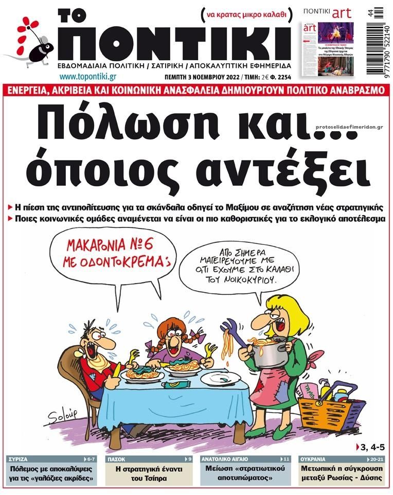 Διαβάστε το πρωτοσέλιδο της εφημερίδας «Το Ποντίκι» σήμερα 3/11/2022.