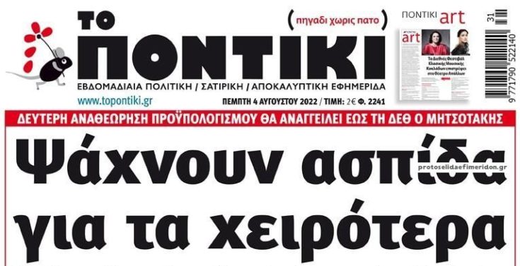 Το Ποντίκι σήμερα Πέμπτη 4/8/2022 3 έτη ago Media ΕΦΗΜΕΡΙΔΕΣ ΠΡΩΤΟΣΕΛΙΔΑ ΤΟ ΠΟΝΤΙΚΙ Διαβάστε το πρωτοσέλιδο της εφημερίδας “Το Ποντίκι” σήμερα 04/8/2022