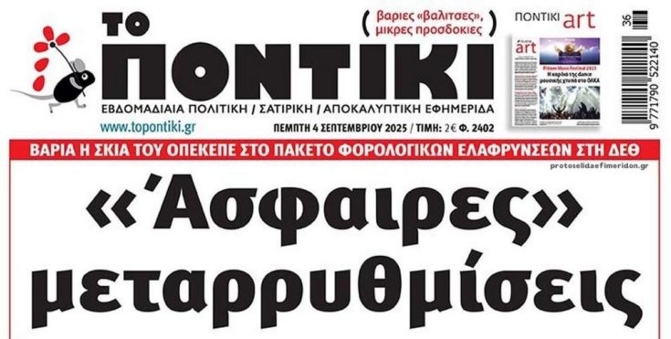 Το Ποντίκι σήμερα Πέμπτη 4/9/2025 4 μήνες ago Media ΕΦΗΜΕΡΙΔΕΣ ΠΡΩΤΟΣΕΛΙΔΑ ΤΟ ΠΟΝΤΙΚΙ Διαβάστε το πρωτοσέλιδο της εφημερίδας «Το Ποντίκι» σήμερα 4/9/2025.