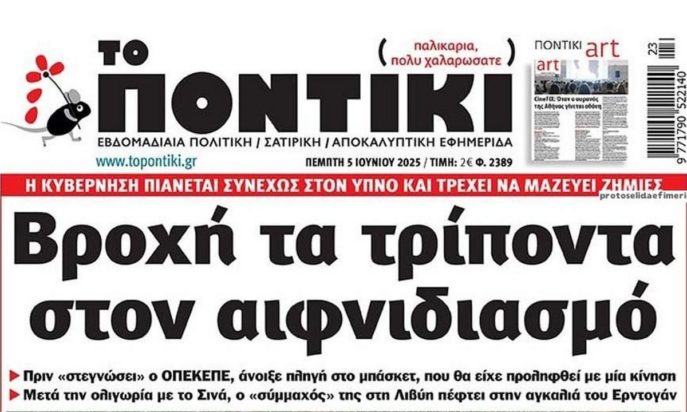 Το Ποντίκι σήμερα Πέμπτη 5/6/2025 7 μήνες ago Media ΕΦΗΜΕΡΙΔΕΣ ΠΡΩΤΟΣΕΛΙΔΑ ΤΟ ΠΟΝΤΙΚΙ Διαβάστε το πρωτοσέλιδο της εφημερίδας «Το Ποντίκι» σήμερα 5/6/2025