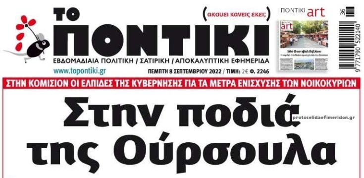 Το Ποντίκι σήμερα Πέμπτη 8/9/2022 3 έτη ago Media ΕΦΗΜΕΡΙΔΕΣ ΠΡΩΤΟΣΕΛΙΔΑ ΤΟ ΠΟΝΤΙΚΙ Διαβάστε το πρωτοσέλιδο της εφημερίδας «Το Ποντίκι» σήμερα 07/09/2022.