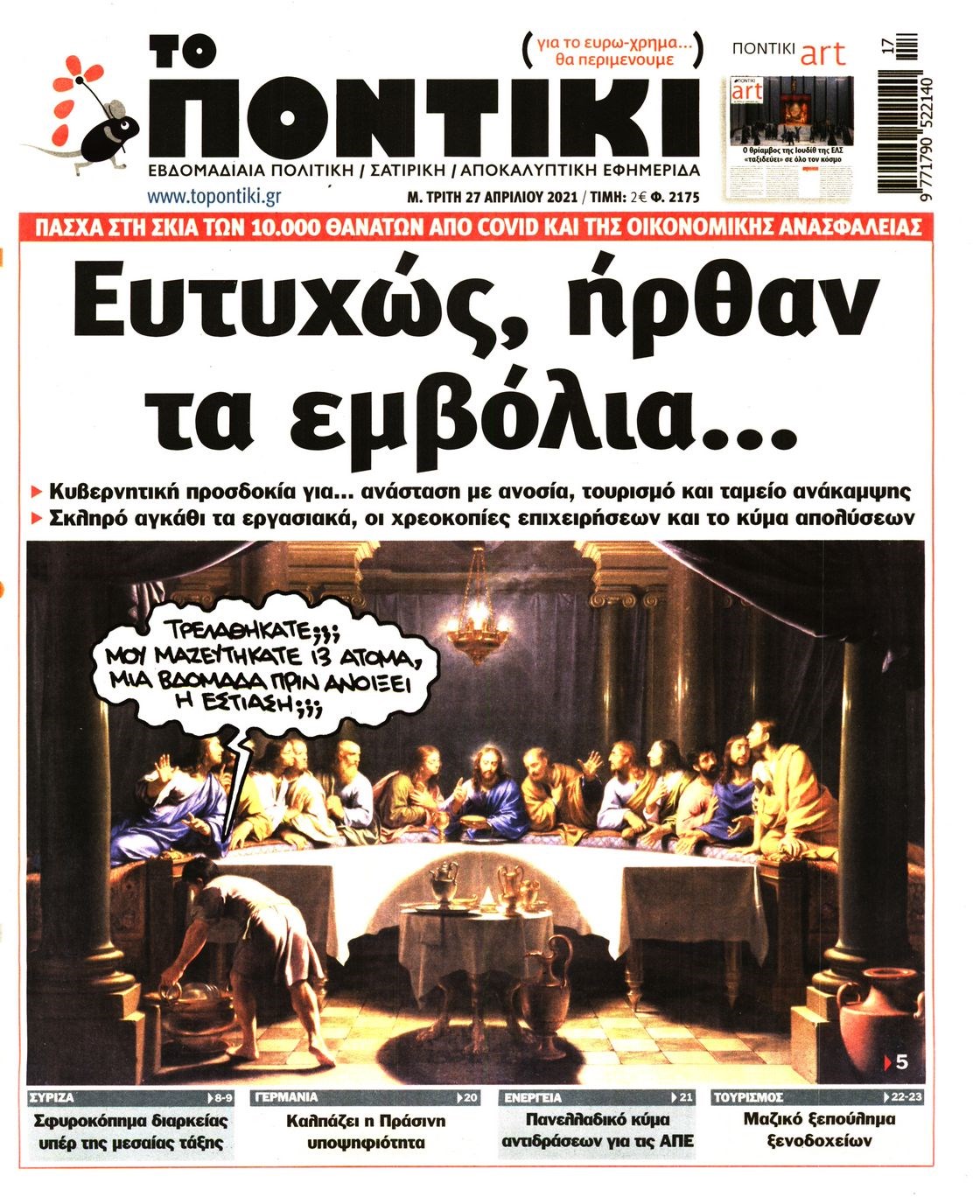 Το Ποντίκι σήμερα Τρίτη 27/4/2021 Διονύσης Νίκκας 06:31, Τρίτη 27 Απριλίου 2021 Media Διαβάστε το πρωτοσέλιδο της εφημερίδας “Το Ποντίκι”… ΠΡΩΤΟΣΕΛΙΔΟ ΤΟ ΠΟΝΤΙΚΙ ΤΟ ΠΟΝΤΙΚΙ Μοιράσου το: σχολίασε κι εσύ (0 σχόλια) Ακολουθήστε το enikos.gr στο Google News και μάθετε πρώτοι όλες τις ειδήσεις Δείτε όλες τις τελευταίες ειδήσεις από την Ελλάδα και τον Κόσμο στο enikos.gr Ειδήσεις Ροή Ειδήσεων 3 ώρες πριν Αγρότες: «Όχι στον διάλογο, μας εμπαίζει η κυβέρνηση» – Αποφάσισαν κλιμάκωση των κινητοποιήσεων, τι θα γίνει τα Χριστούγεννα 3 ώρες πριν Την πρώτη Belharra παρέλαβε η χώρα μας, υψώθηκε η ελληνική σημαία στη φρεγάτα «Κίμων» – Δένδιας: «Το ισχυρότερο Πολεμικό Ναυτικό που είχε ποτέ ο ελληνισμός» 1 ώρα πριν Γιώργος Μαζωνάκης: «Έχει υποστεί ένα σωρό εκβιαστικές πρακτικές – Του είπαν ότι θα του βάλουν τον συγκεκριμένο άνθρωπο να τον καταγγείλει» 3 ώρες πριν Μιχάλης Χουρδάκης: «Είμαι διαθέσιμος να συμβάλω στην προσωρινή κάλυψη του ιατρείου της Ψερίμου» – Η επιστολή στον Άδωνι Γεωργιάδη 3 ώρες πριν Εξώδικο Γεωργιάδη στην Κωνσταντοπούλου – «Με κατηγόρησε ότι έχω καταδικαστεί για παιδεραστία» 46 λεπτά πριν Γάμος: 11 ψυχρές αλλά ευγενικές φράσεις, που λέει ένας άνδρας όταν σκέφτεται τον χωρισμό 4 ώρες πριν Τα 5 ζώδια που θα ευνοηθούν στα οικονομικά τους το 2026 – «Τραβούν το χρήμα σαν μαγνήτες» 5 ώρες πριν Αυτό που κρύβεται κάτω από τη Γροιλανδία θα μπορούσε να ανατρέψει όσα γνωρίζουμε για την άνοδο της στάθμης των θαλασσών 1 ημέρα πριν 20 χρόνια τα Χριστούγεννα ξεκινούν στα Public με μεγάλη ποικιλία σε δώρα! 1 λεπτό πριν Στη φυλακή ο «Έλληνας Εσκομπάρ» και τρεις συνεργοί του για το φορτίο με την κοκαΐνη – Τι υποστήριξε στην απολογία του 5 λεπτά πριν ΕΕ: Καλεί τα Σκόπια να σέβονται τις δεσμεύσεις από τη διαδικασία ένταξης και το Διεθνές Δίκαιο – Η χρηματοδότηση του Διαδρόμου Χ 12 λεπτά πριν Σοκ στη Σουηδία: 12χρονος πληρωμένος δολοφόνος σκότωσε λάθος άτομο 16 λεπτά πριν FIFA: Έτοιμη να… επανεντάξει τη Ρωσία από το 2026 21 λεπτά πριν Live η κίνηση: Στο «κόκκινο» Κηφισός, Κηφισίας και οι δρόμοι στο κέντρο – Καθυστερήσεις και στην Αττική Οδό ENIKOS NETWORK Ξεκίνησε η «επέλαση» της γρίπης στην Ελλάδα-Ποιοι κινδυνεύουν ΕΟΔΥ: Δωρεάν τεστ για HIV, Ηπατίτιδες, Σύφιλη, Χλαμύδια, Γονόρροια Κλιμάκωση των κινητοποιήσεων αποφάσισαν οι αγρότες, κλείνουν παρακαμπτήριους την Παρασκευή – Τι απαντά η κυβέρνηση Ευλογιά αιγοπροβάτων: Νέες αποζημιώσεις ύψους 26,02 εκατ. ευρώ σε κτηνοτρόφους – Η κατανομή ανά Περιφέρεια Χαρτογραφώντας το «σημείο χωρίς επιστροφή»: Για πρώτη φορά αποκαλύπτεται με λεπτομέρεια το ακανθώδες όριο της ατμόσφαιρας τ... Η Google καταργεί τη λειτουργία «dark web report» – Πώς θα μπορούν οι χρήστες να διαγράφουν τα δεδομένα τους περισσότερα 17:45 , Πέμπτη 18 Δεκεμβρίου 2025 ROUK ZOUK: Εορταστικό επεισόδιο με καλεσμένους τους πρωταγωνιστές του «Γιατί ρε πατέρα» Το Σάββατο 20 Δεκεμβρίου στις 21:00, η Ζέτα Μακρυπούλια υποδέχεται εκλεκτούς ηθοποιούς που όλο... 17:20 , Πέμπτη 18 Δεκεμβρίου 2025 Άγιος έρωτας: Η Χριστίνα εξομολογείται στον πατέρα Νικόλαο, απόψε στις 21:00 στον Alpha Η Νότα αποφασίζει να εκδικηθεί τον Πέτρο και τον Στέφανο, για χάρη του Λούη, όμως τα πράγματα ... 16:50 , Πέμπτη 18 Δεκεμβρίου 2025 Να μ’ αγαπάς: Ζωή και Φωτεινή συμφιλιώνονται ως μάνα με κόρη, απόψε στις 20:00 Η ταυτότητα του Άγγελου αποκαλύπτεται στο νέο επεισόδιο της σειράς “Να μ’ αγαπάς... 15:52 , Πέμπτη 18 Δεκεμβρίου 2025 Το Σπίτι Δίπλα Στο Ποτάμι: Το καθηλωτικό τελευταίο επεισ