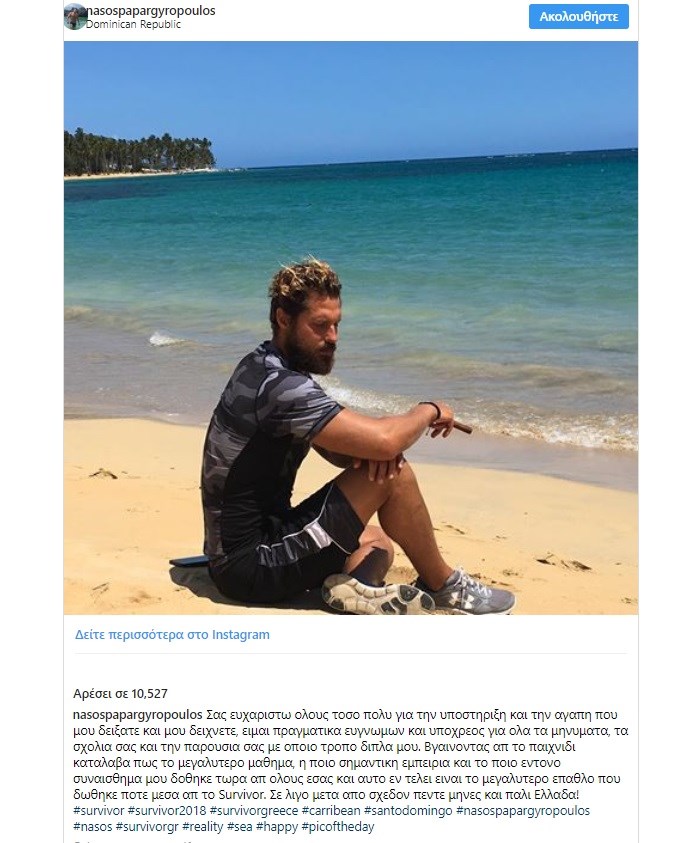 Το πρώτο του μήνυμα μετά την αποχώρησή του από το Survivor έστειλε ο Νάσος Παπαργυρόπουλος.