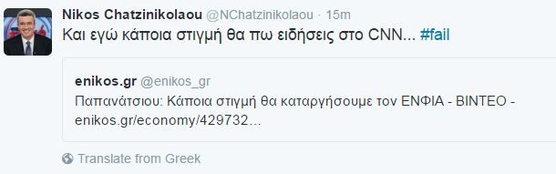 “Και εγώ κάποια στιγμή θα πω ειδήσεις στο CNN… #fail” έγραψε ο Νίκος Χατζηνικολάου στο Twitter.