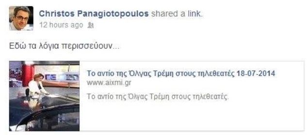 Ο Διευθυντής Ειδήσεων και Ενημέρωσης του MEGA Χρήστος Παναγιωτόπουλος έκανε το δικό του σχόλιο μέσω της προσωπικής του σελίδας στο Facebook για τον αποχαιρετισμό της Όλγας Τρέμη.