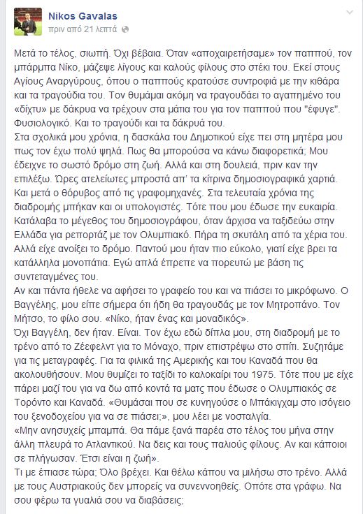 Αναλυτικά τα όσα έγραψε ο Νίκος Γαβάλας: